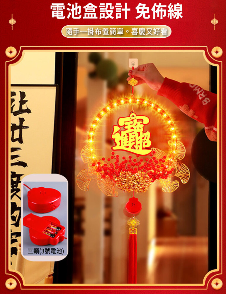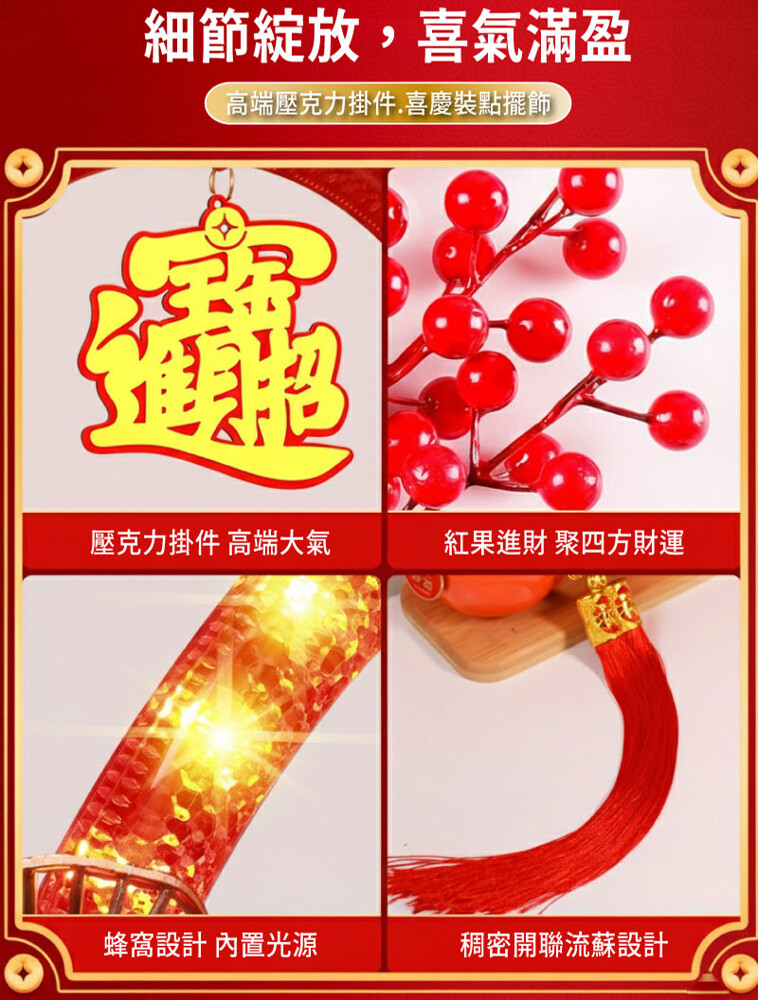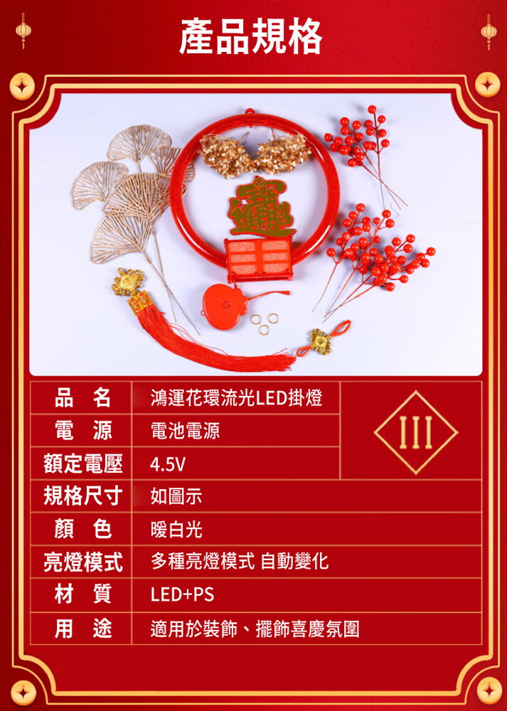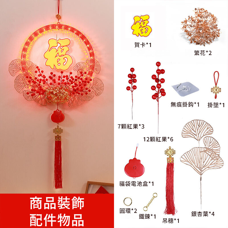圓環*1、賀卡*1、繁花*2、7顆紅果*3、12顆紅果*6、無痕掛鉤*1、掛墜*1、福袋電池盒*1