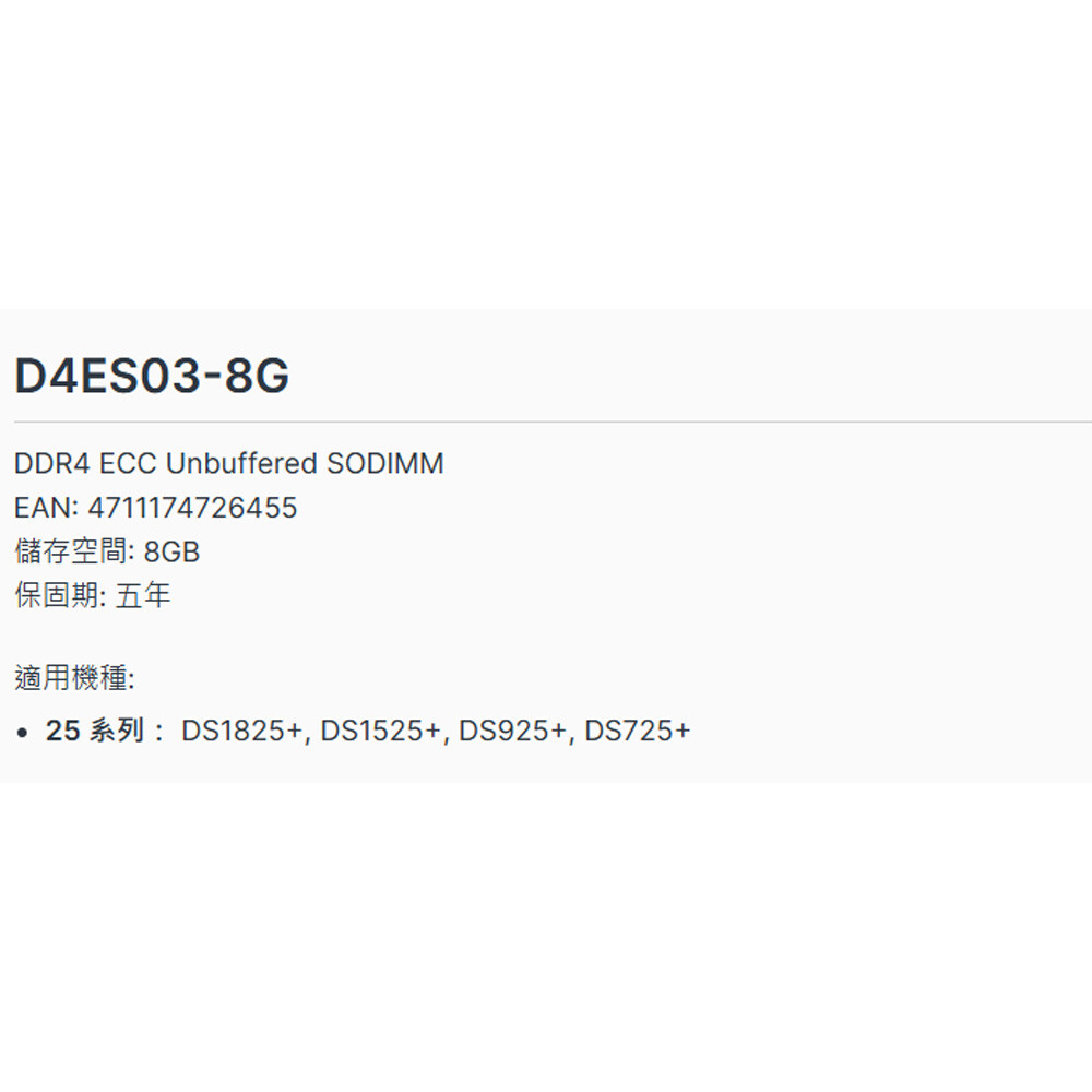 DDR4 ECC Unbuffered SODIMM EAN: 4711174726455 儲存空間: 8GB 保固期: 五年 適用機種: 25 系列:DS1825+, DS1525+, DS925+, DS725+