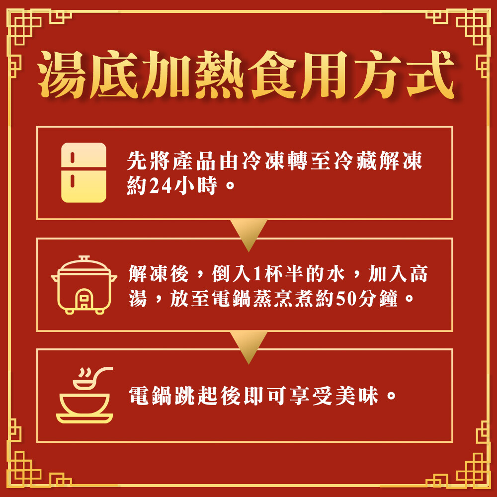 慢火加熱即可享用,加入自己喜歡的料,便是一道養生澎派的金勾魚翅鍋!
