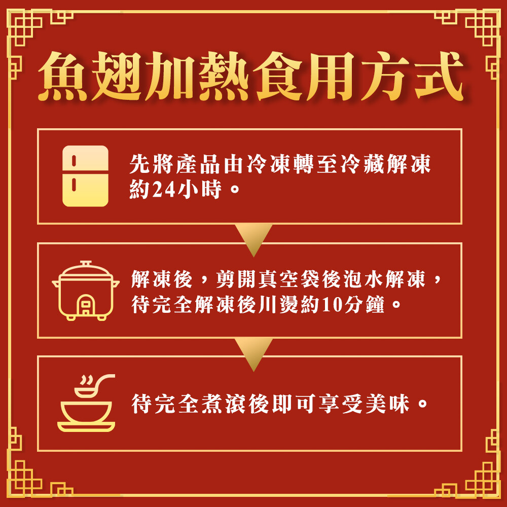 比起形狀分離的散翅更顯大氣美觀,是稀有的名貴高級海味食材,更是過年過節的送禮首選!