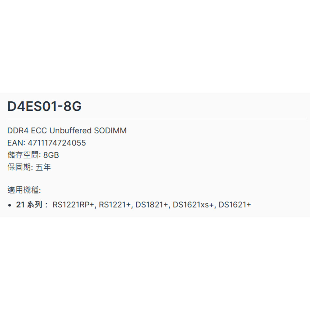 DDR4 ECC Unbuffered SODIMM EAN: 4711174724055 儲存空間: 8GB 保固期: 五年 適用機種: 21 系列:RS1221RP+, RS1221+, DS1821+, DS1621xs+, DS1621+