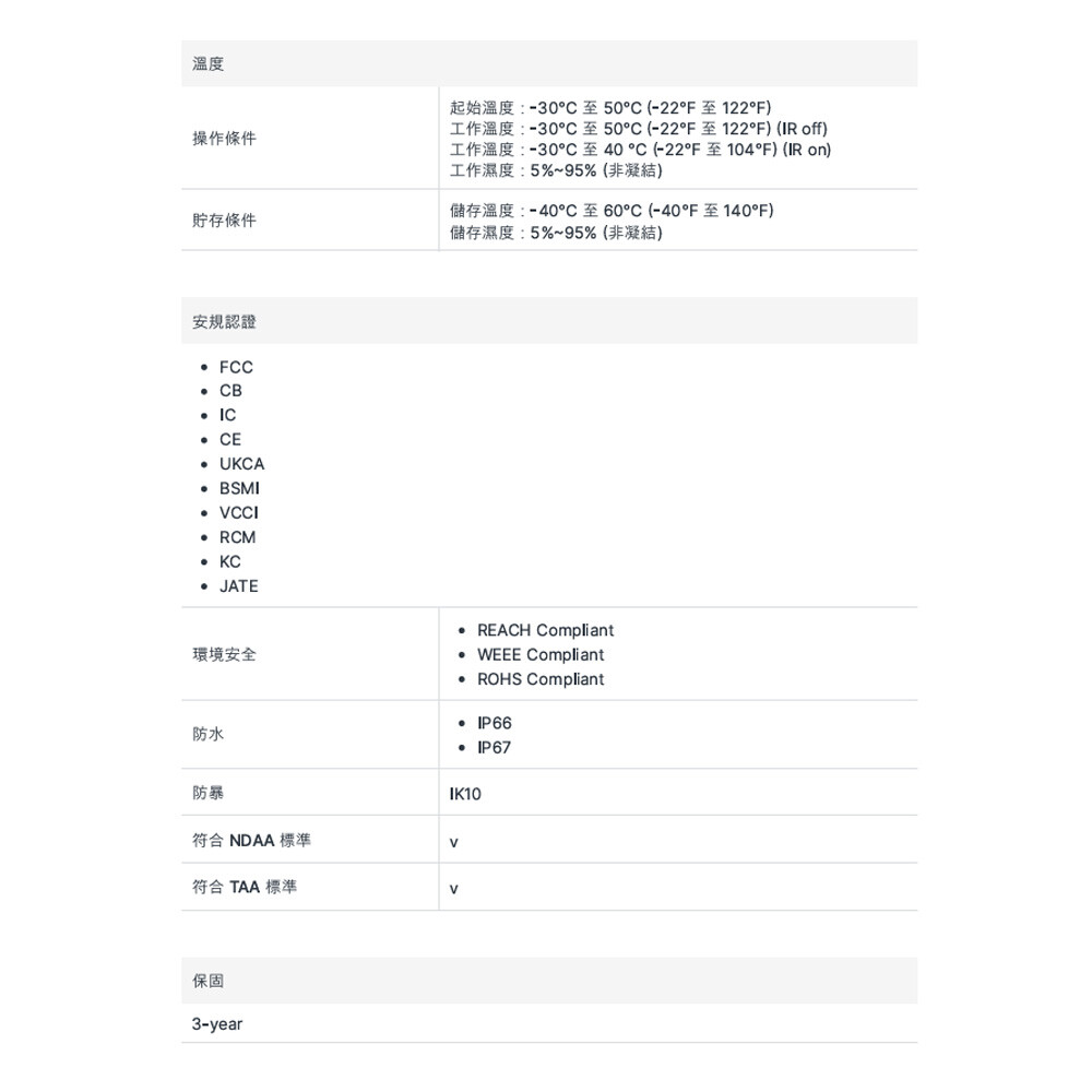 TC500 為一款具備 IP67 防水等級、5 MP 廣角,室內與室外均適用的多功能 AI 攝影機。搭載 2880x1620@ 30 FPS 的高解析度、110° 的水平廣角視野與夜視功能,可滴水不漏地捕捉您需要的所有細節。