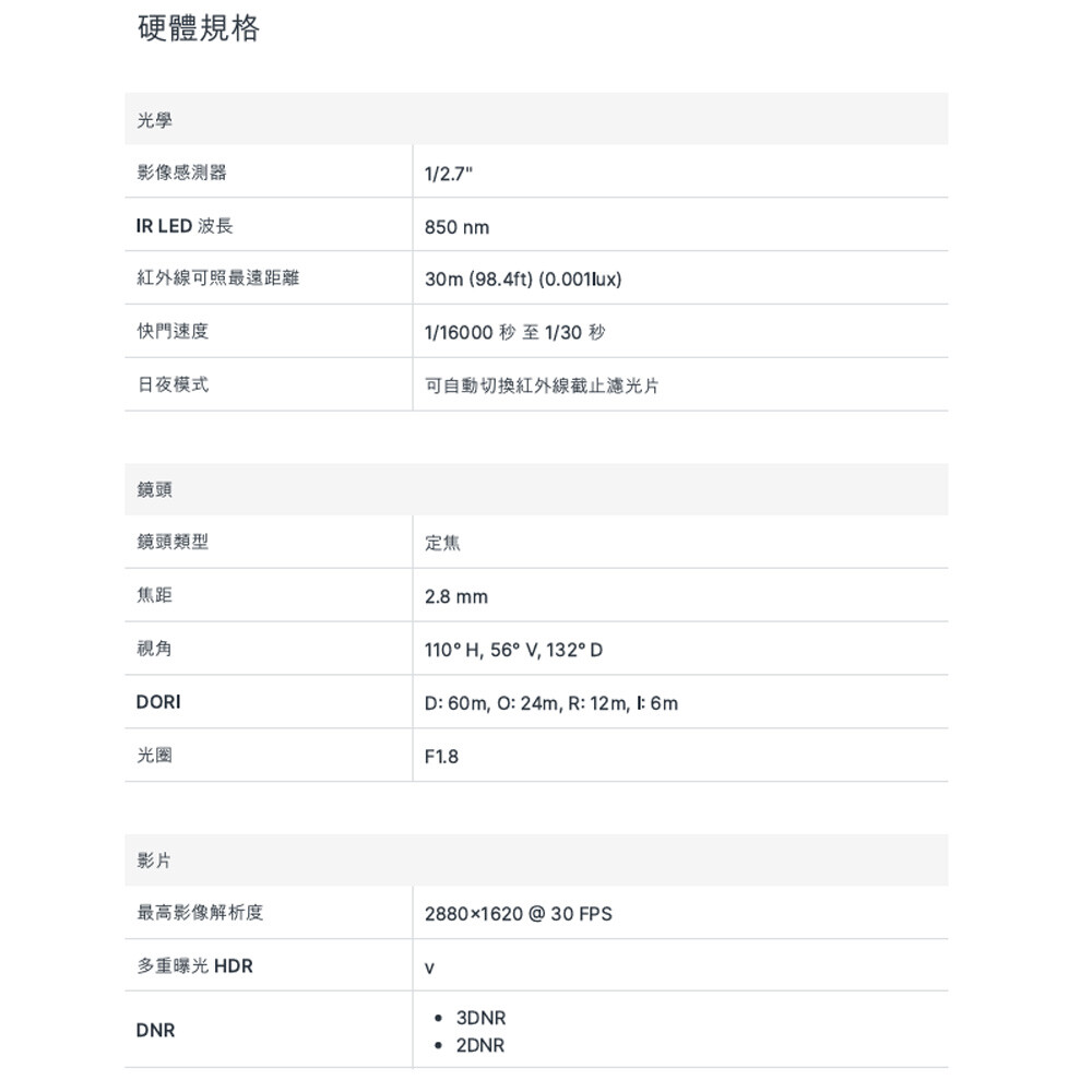 廣角鏡頭搭載 5 MP 感光元件可錄製 30 FPS 影像、透過高功率 IR LED 夜視力可達 30 公尺
