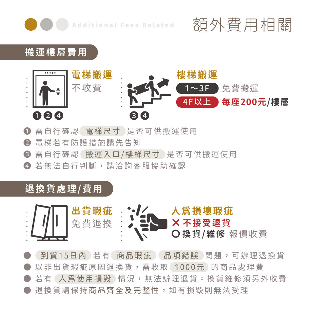5 需經樓梯搬運,1F-3F免收樓層搬運費,多一層加收200元/件(4F加收200元,5F加收400元,以此類推)