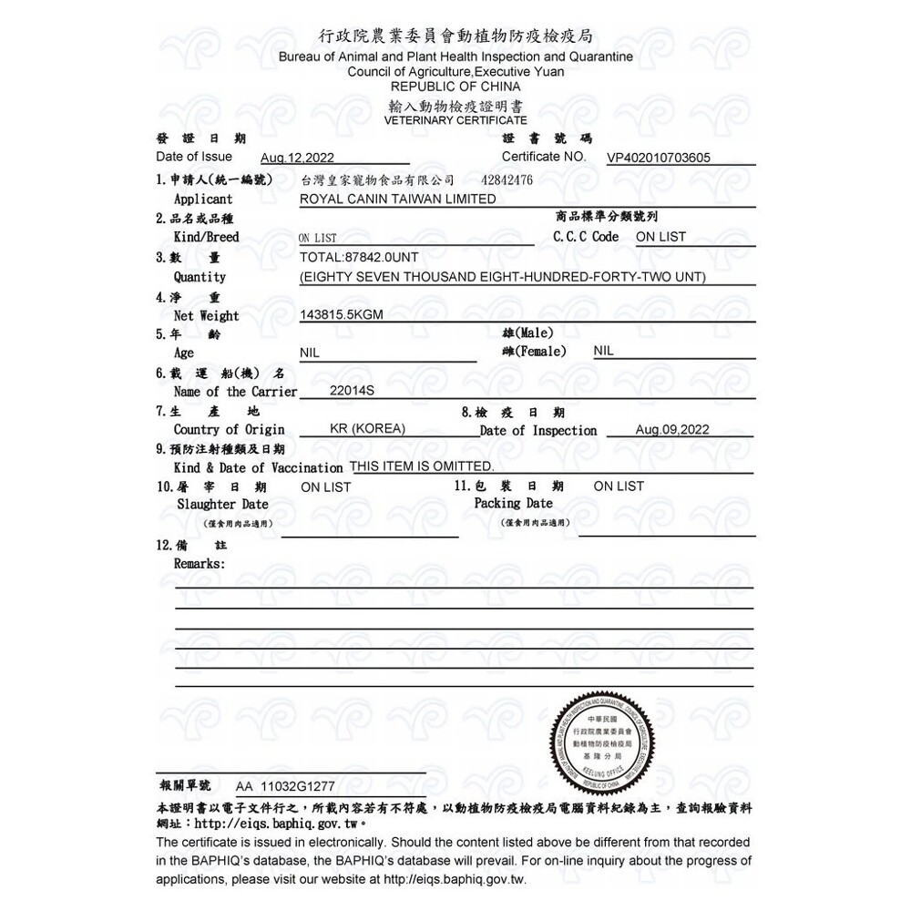 成分:脫水禽肉蛋白、米、小麥麩質*、動物脂肪、玉米粉、水解動物蛋白(家禽、魚肉)、小麥麵粉、玉米麩質、酵母產品、礦物質、蔬菜纖維、甜菜漿、大豆油、魚油、洋車前子及殼、果寡糖、水解酵母(甘露寡糖及B-葡聚糖來源)(0.29%)、裂殖壺藻油(DHA來源)、金盞花。添加劑(每千克)
