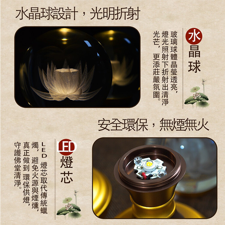 LED燈芯取代傳統蠟燭,避免火源與煙燻,真正做到 環保供燈,守護佛堂清淨。