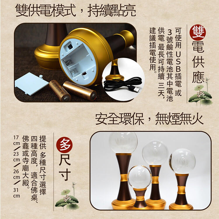 支援 USB插電 + 電池雙供電模式,無論寺院大殿或居家佛堂,都能長久安放,讓光明常伴左右。