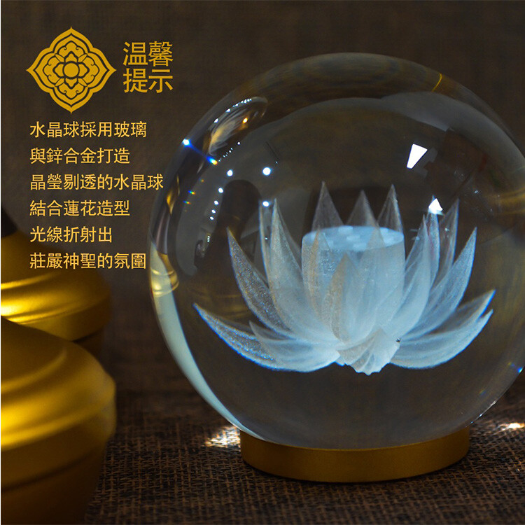 「水晶球蓮花供燈」採用玻璃與鋁合金打造,晶瑩剔透的水晶球結合蓮花造型,光線折射出莊嚴神聖的氛圍。
