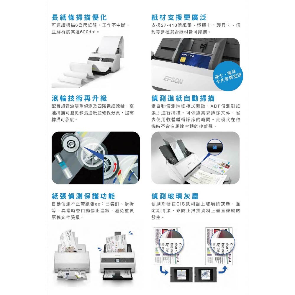 65ppm(單面) / 130ipm(雙面) 的驚人掃描速度,輔以Epson獨家技術,200dpi、300dpi同速,硬體解析度可達600dpi;同時裝置超音波雙重偵測及四顆進紙滾輪,確保分頁,避免多張進紙,提高掃描可靠度