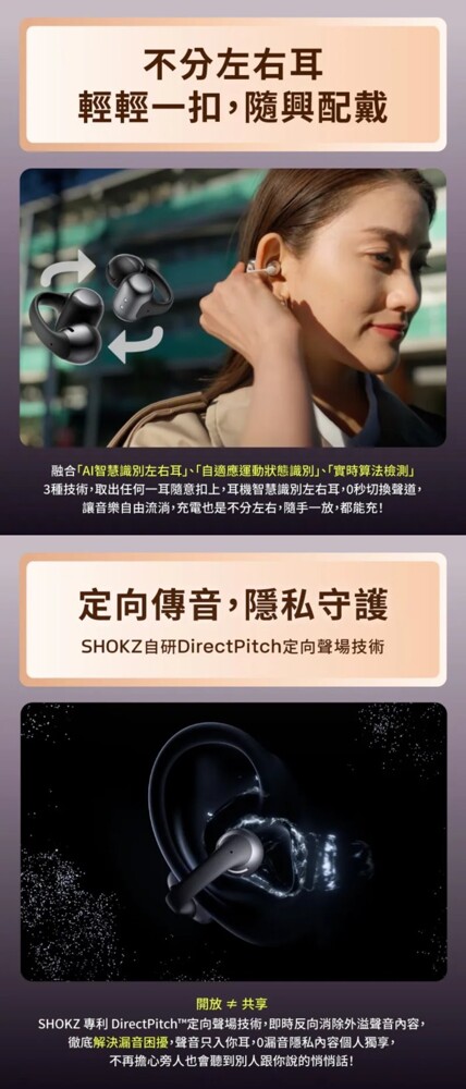 Shokz DirectPitch™ 定向聲場技術,解決漏音困擾。