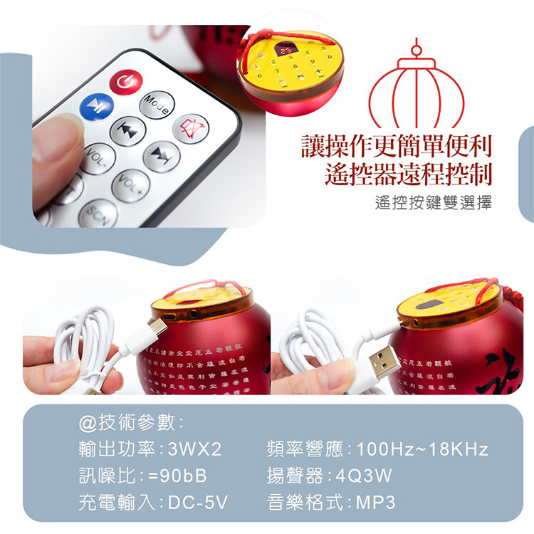 產品配件:念佛機 x1、USB電源線 x1、遙控器 x1、產品保固說明書 x1。