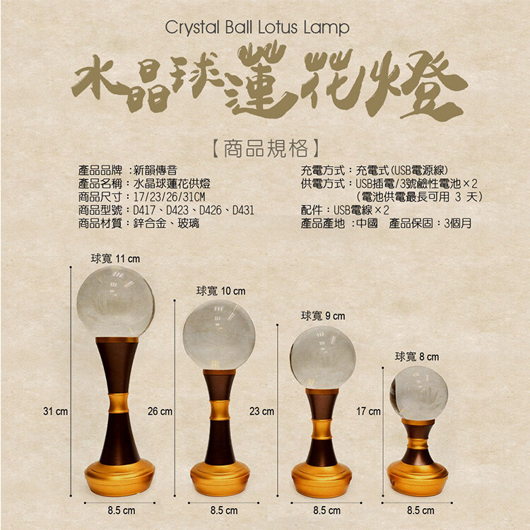 「水晶球蓮花供燈」採用玻璃與鋁合金打造,晶瑩剔透的水晶球結合蓮花造型,光線折射出莊嚴神聖的氛圍。