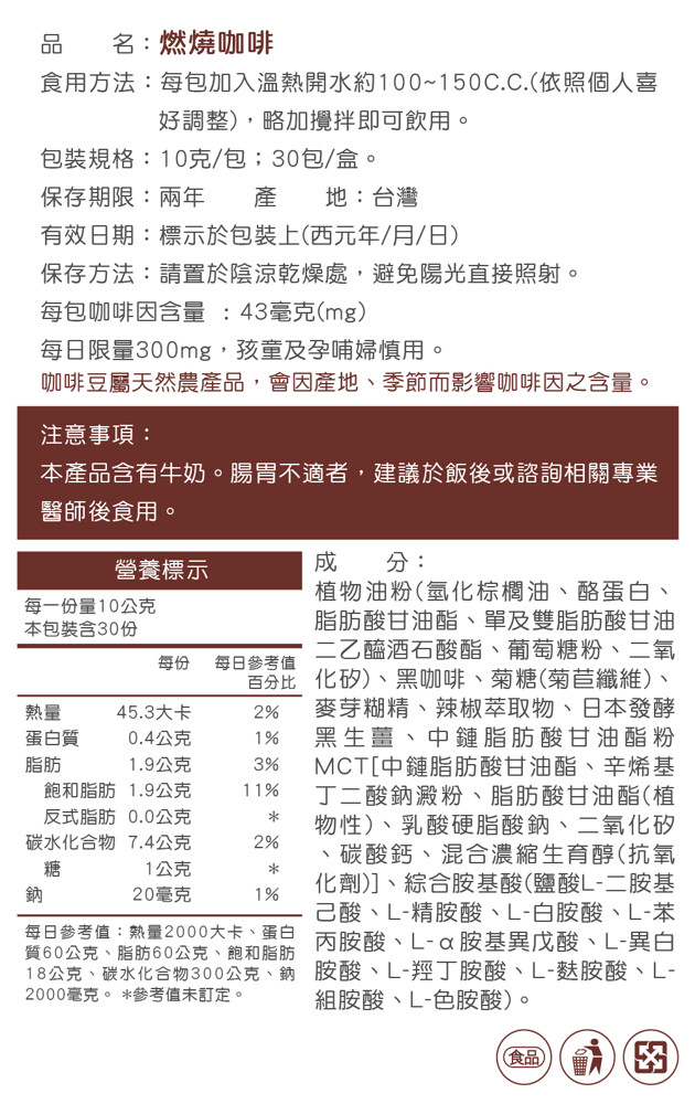 ◆拿鐵風味,奶香甘醇,1包45大卡