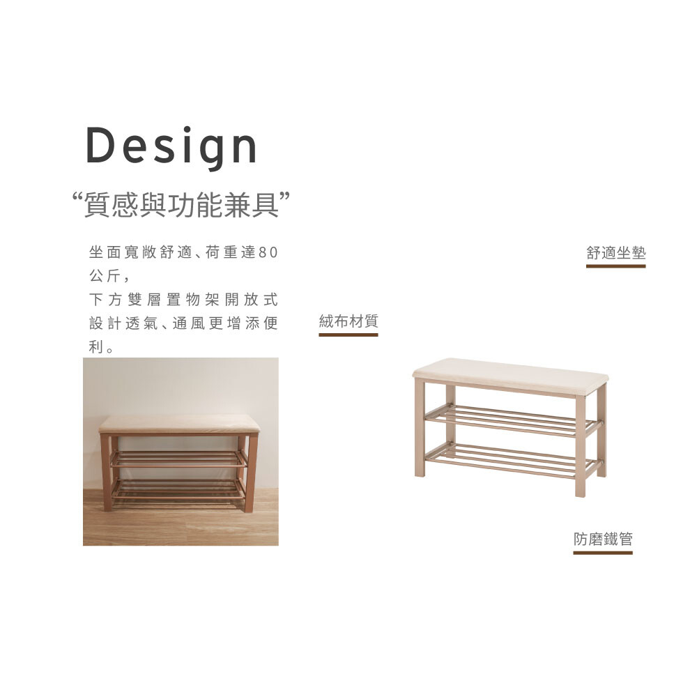 坐墊厚度3公分,舒適好坐 絨布材質質感加分、好清潔 鐵管噴漆不易生鏽,防磨耐刮 雙層空間,輕鬆放置、拿取 組裝方式:自行組裝 材質:鐵管噴漆,绒布+海綿坐墊 尺寸:80.5Wx31Dx47.5Hcm 重量 : 7.12kg