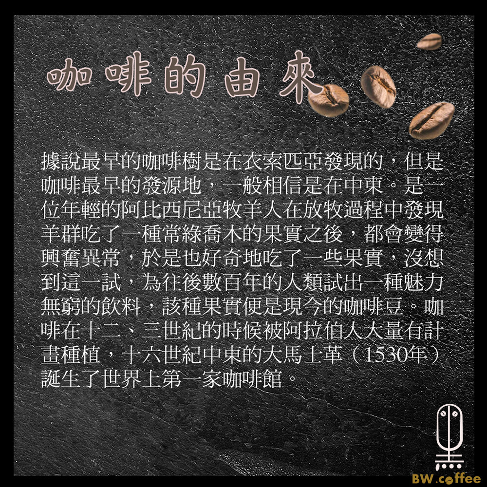 據說最早的咖啡樹是在衣索匹亞發現的,但是咖啡最早的發源地,一般相信是在中東。是一位年輕的阿比西尼亞牧羊人在放牧過程中發現羊群吃了一種常綠喬木的果實之後,都會變得興奮異常,於是也好奇地吃了一些果實,沒想到這一試,為往後數百年的人類試出一種魅力無窮的飲料,該種果實便是現今的咖啡豆。咖啡在十二、三世紀的時候被阿拉伯人大量有計畫種植,十六世紀中東的大馬士革(1530年)誕生了世界上第一家咖啡館。