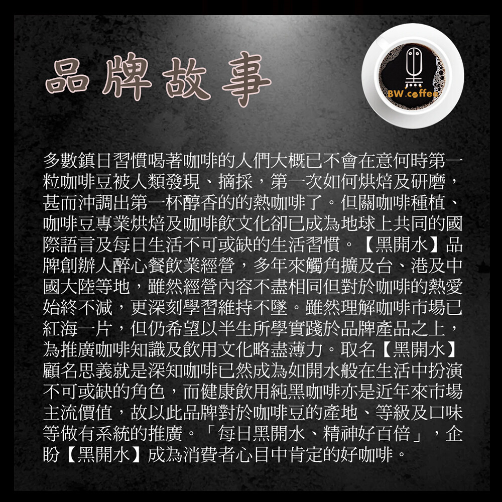 多數鎮日習慣喝著咖啡的人們大概已不會在意何時第一粒咖啡豆被人類發現、摘採,第一次如何焙焙及研磨,甚而沖調出第一杯醇香的的熱咖啡了。但關咖啡種植、咖啡豆專業烘焙及咖啡飲文化卻已成為地球上共同的國際語言及每日生活不可或缺的生活習慣。【黑開水】品牌創辦人醉心餐飲業經營,多年來觸角擴及台、港及中國大陸等地,雖然經營內容不盡相同但對於咖啡的熱愛始終不減,更深刻學習維持不墜。雖然理解咖啡市場已紅海一片,但仍希望以半生所學實踐於品牌產品之上,為推廣咖啡知識及飲用文化略盡薄力。取名【黑開水】顧名思義就是深知咖啡已然成為如開水般在生活中扮演不可或缺的角色,而健康飲用純黑咖啡亦是近年來市場主流價值,故以此品牌對於咖啡豆的產地、等級及口味等做有系統的推廣。「每日黑開水、精神好百倍」,企盼【黑開水】成為消費者心目中肯定的好咖啡。