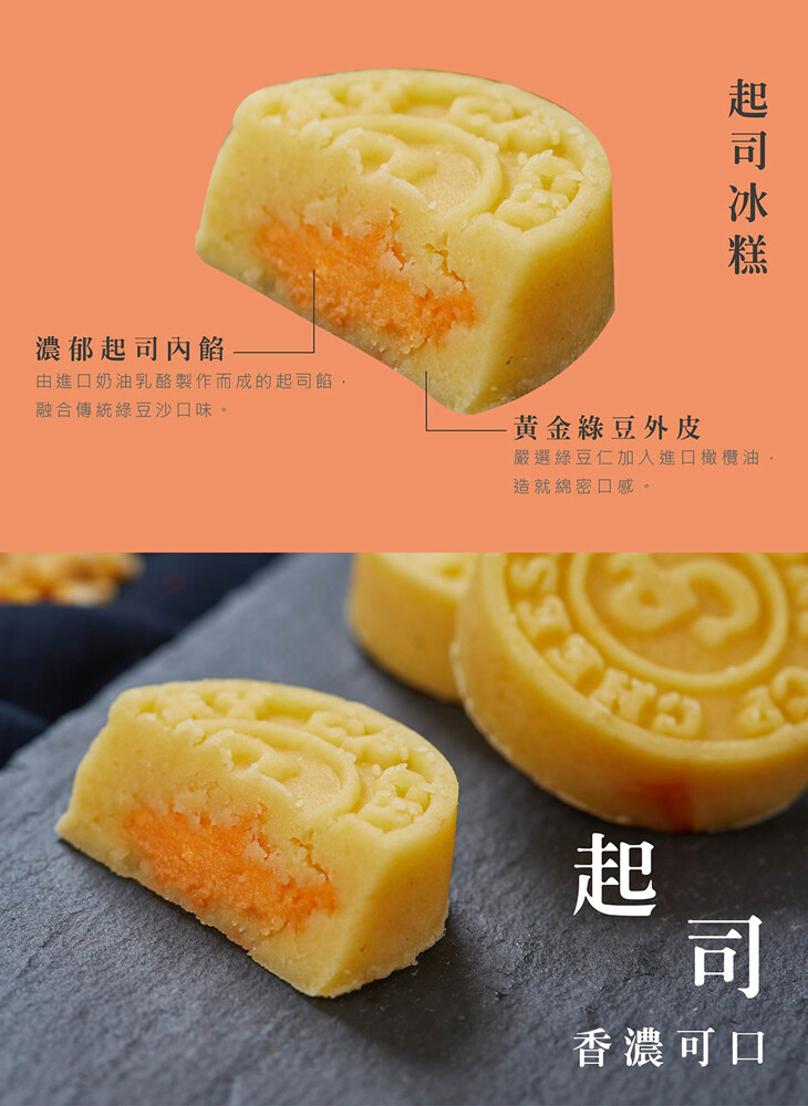 黃金綠豆外皮嚴選綠豆仁加入進口橄欖油,造就綿密口感,內餡由進口奶油乳酪製成的起司餡,融合傳統綠豆沙口味。