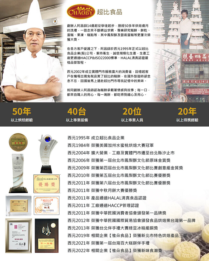 在各方客戶愛護之下,阿昌師於西元1995年正式以超比食品企業(股)公司,秉持衛生、誠信規模化生產,生產工廠更通過HACCP&ISO22000標準、HALAL清真認證嚴格品管製程。