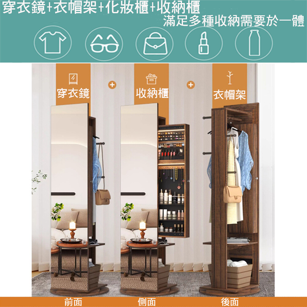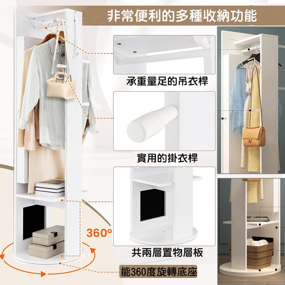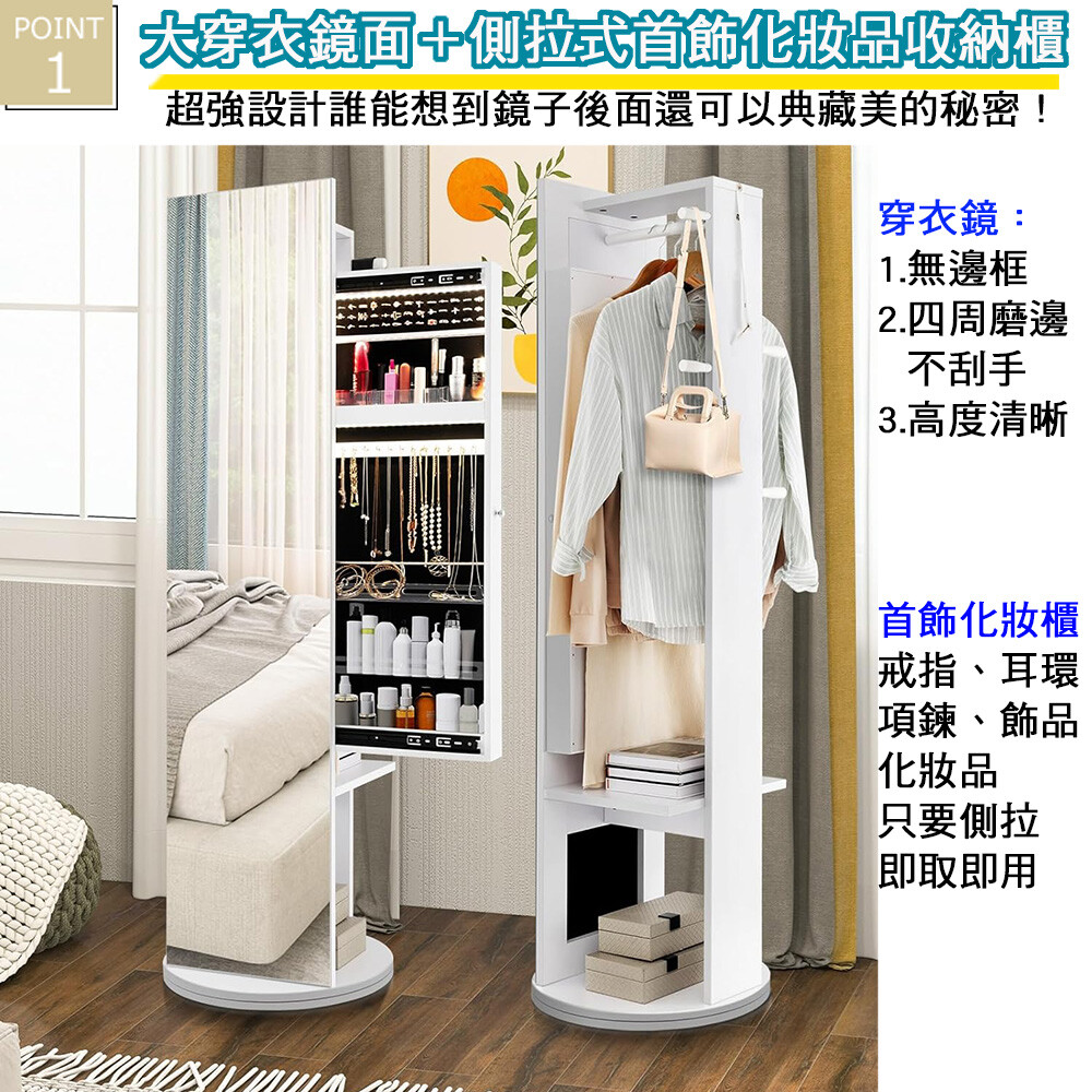 此外360度回轉的絕佳設計可以左右轉動調整照映角度,原地站好就能照照鏡子讓您美美的出門,吊掛在後方的衣物與收納的物品也能靠旋轉櫃體隨手可得。