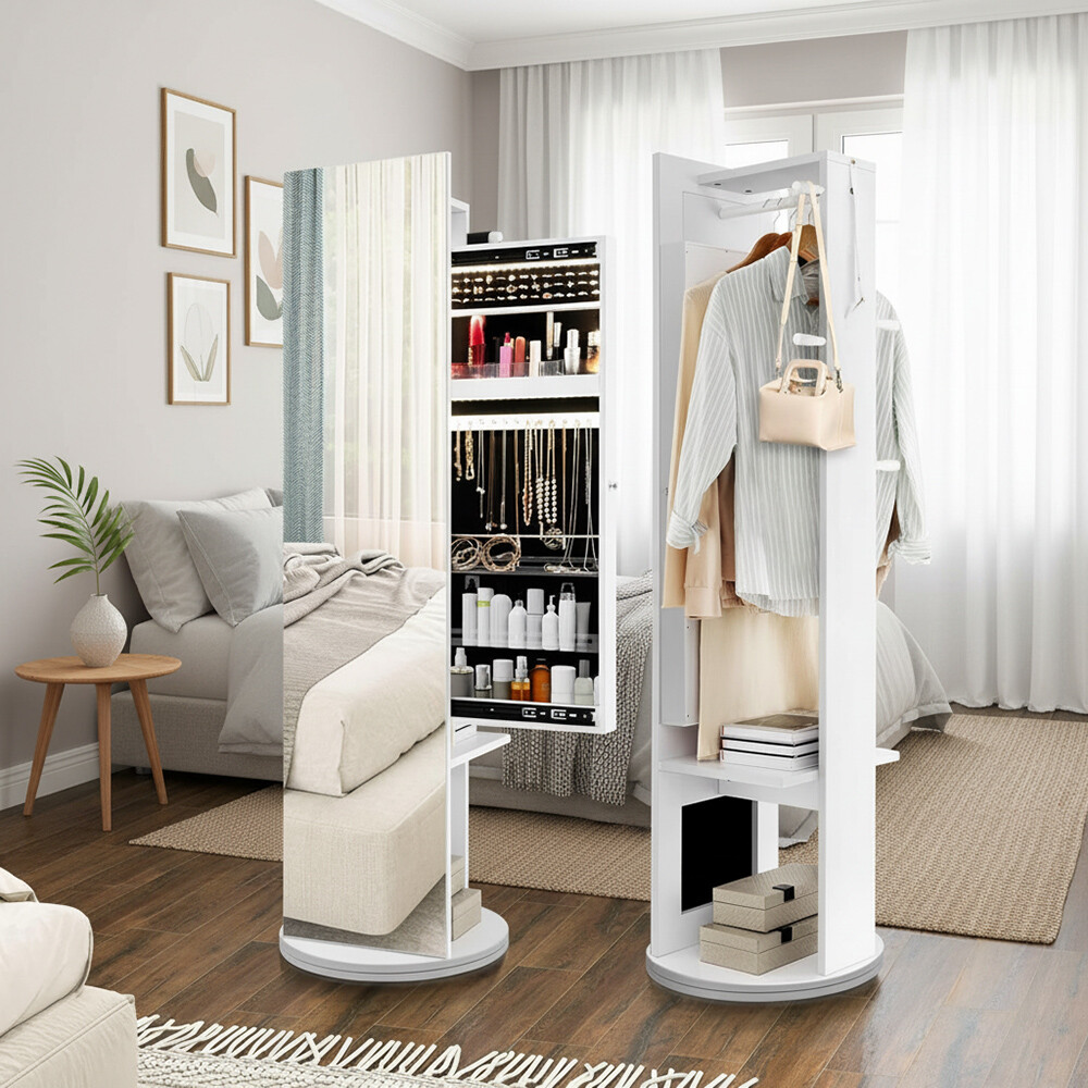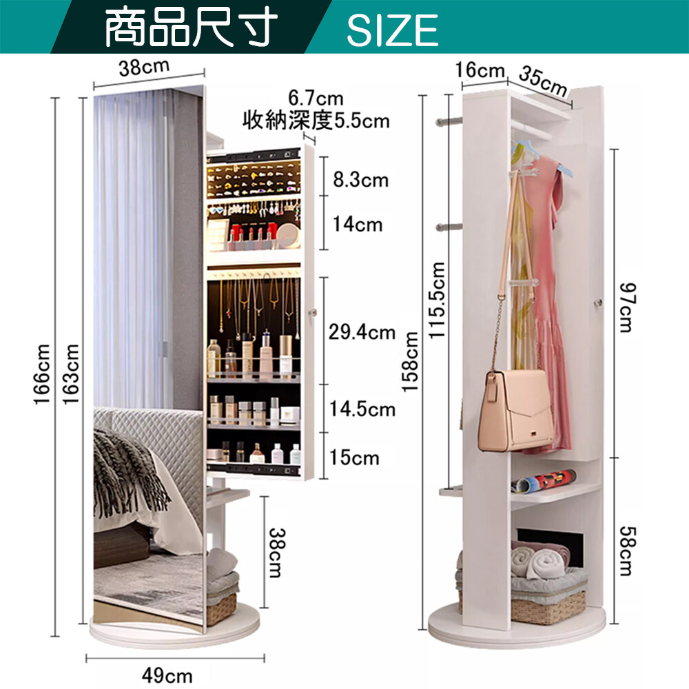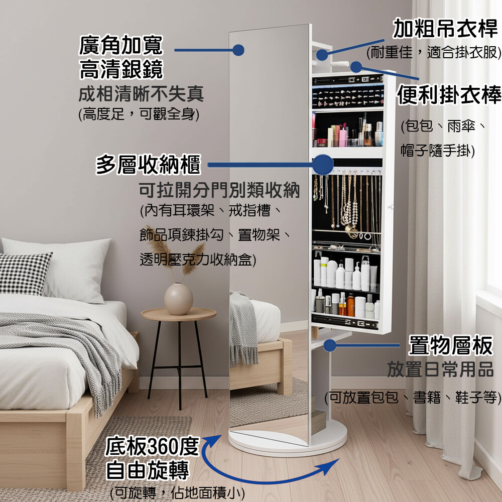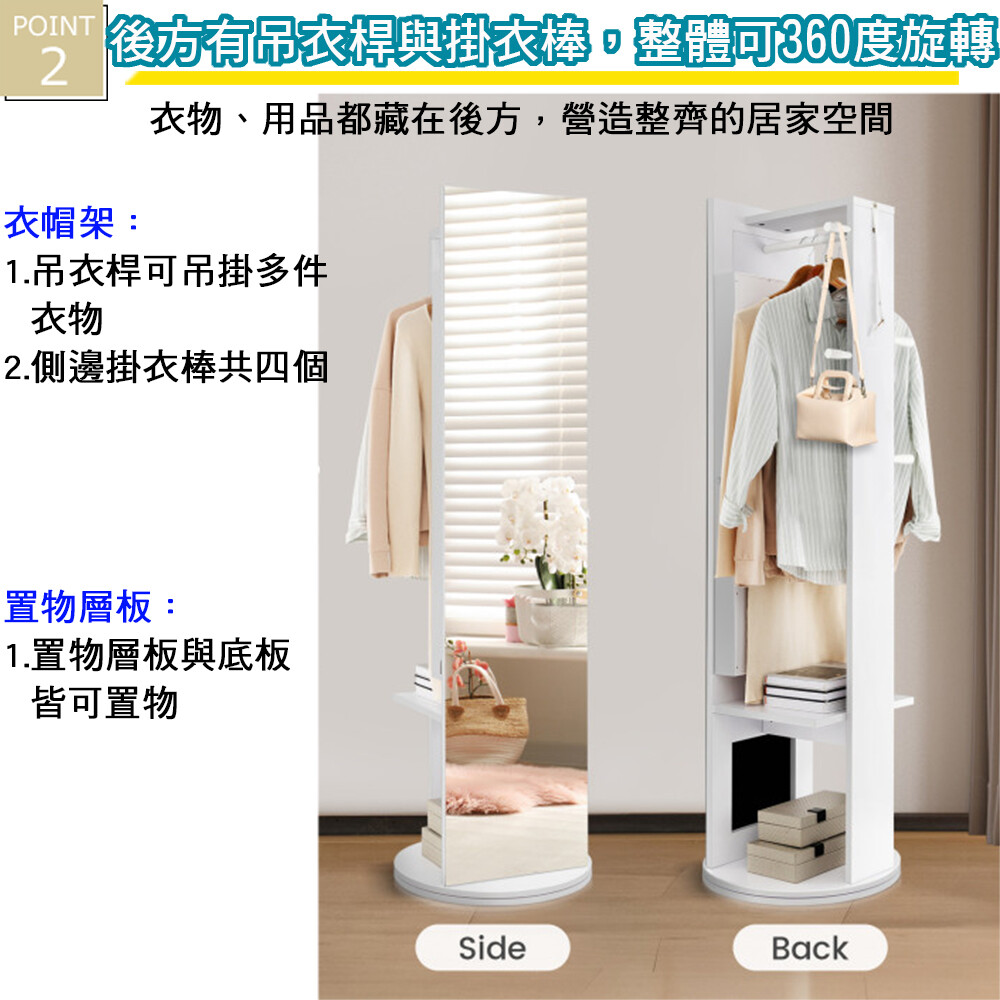 此外360度回轉的絕佳設計可以左右轉動調整照映角度,原地站好就能照照鏡子讓您美美的出門,吊掛在後方的衣物與收納的物品也能靠旋轉櫃體隨手可得。
