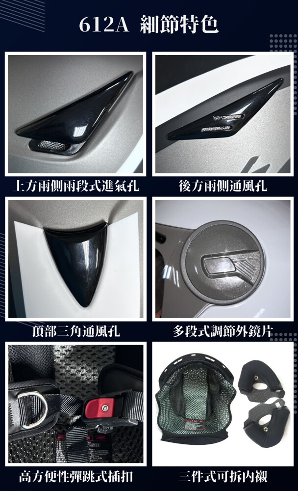 釦具:配置ZEUS專利級E8彈跳式釦具,讓騎士更能安心駕馭。