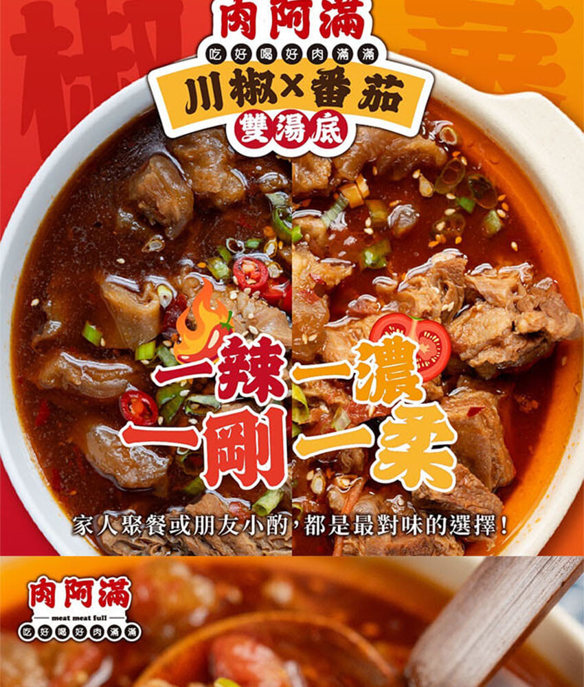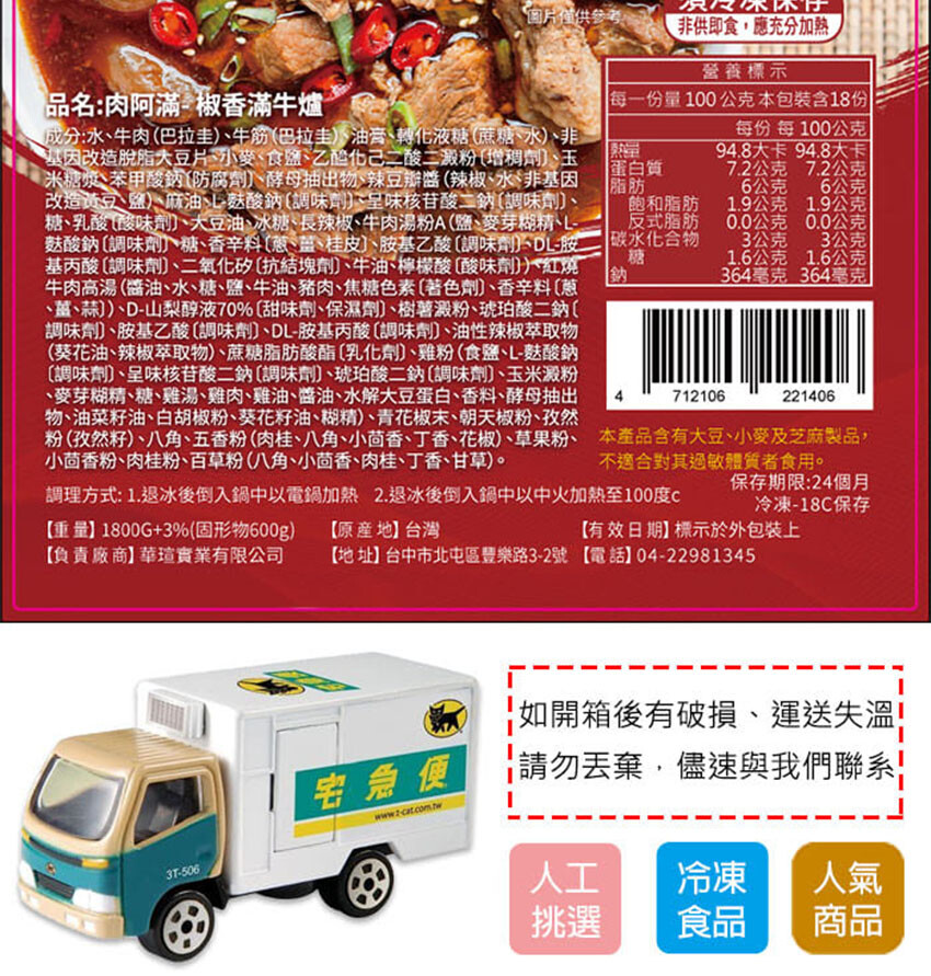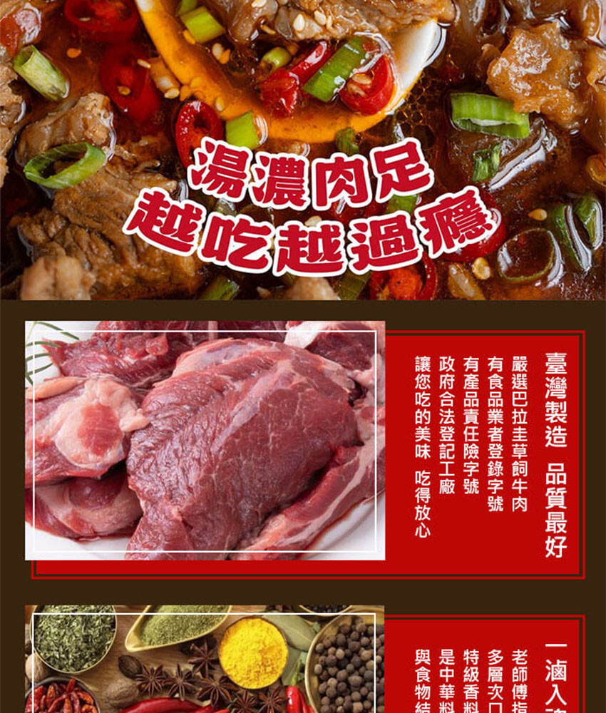 成份:水、牛肉(巴拉圭)、牛筋(巴拉圭)、番茄丁(去皮番茄、番茄汁、鹽、檸檬酸(酸味劑)、番茄糊、番茄醬、辣豆瓣醬(辣椒、水、非基因改造黃豆、鹽、乙醯化己二酸二澱粉(增稠劑)、芝麻油)、玉米糖漿、乳酸(酸味劑)、醬油、牛肉湯粉A(鹽、麥芽糊精、L-麩酸鈉(調味劑)、糖、牛肉(紐西蘭)、香辛料(蔥、薑、桂皮)、胺基乙酸(調味劑)、DL-胺基丙酸(調味劑)、二氧化矽(抗結塊劑)、牛油、檸檬酸(酸味劑)、砂糖(蔗糖)、高鮮調味粉L(L-麩酸鈉(調味劑)、琥珀酸二鈉(調味劑)、胺基乙酸(調味劑)、DL-胺基丙酸(調味劑)、鹽(氯化鈉、碳酸鉀)、雞粉(食鹽、L-麩酸鈉(調味劑)、5'-次黃嘌呤核苷酸二鈉(調味劑)、5'-鳥嘌呤核苷酸二鈉(調味劑)、磷酸二鈉(調味劑)、玉米澱粉、麥芽糊精、雞湯、雞肉、雞油、醬油、水解大豆蛋白、香料、酵母抽出物、油菜籽油、白胡椒粉、葵花籽油)、雞肉萃取物(雞肉、水、乳糖)、雞肉熱反應香料(L-麩酸鈉(調味劑)、葡萄糖、木糖、蔗糖脂肪酸酯(乳化劑)、L-白胺酸、紅蔥頭、薑粉、麥芽糊精、肉桂粉、小茴香粉、丁香粉、甘草粉、水解大豆蛋白(非基因改造)、呈味核苷酸二鈉(調味劑)、典鹽、關華豆膠(增稠劑)、山梨醇液70%(甜味劑、保濕劑)、雞油、香料、酵母抽出物)、冰糖、鰹魚調味料(L-麩酸鈉、5'黃嘌呤核苷酸二鈉(調味劑)、琥珀酸二鈉(調味劑)、乳糖、乾燻鰹魚、鰹魚抽出物、酵母抽出物、木糖、麥芽糖、葡萄糖、糊精)、白胡椒粉。