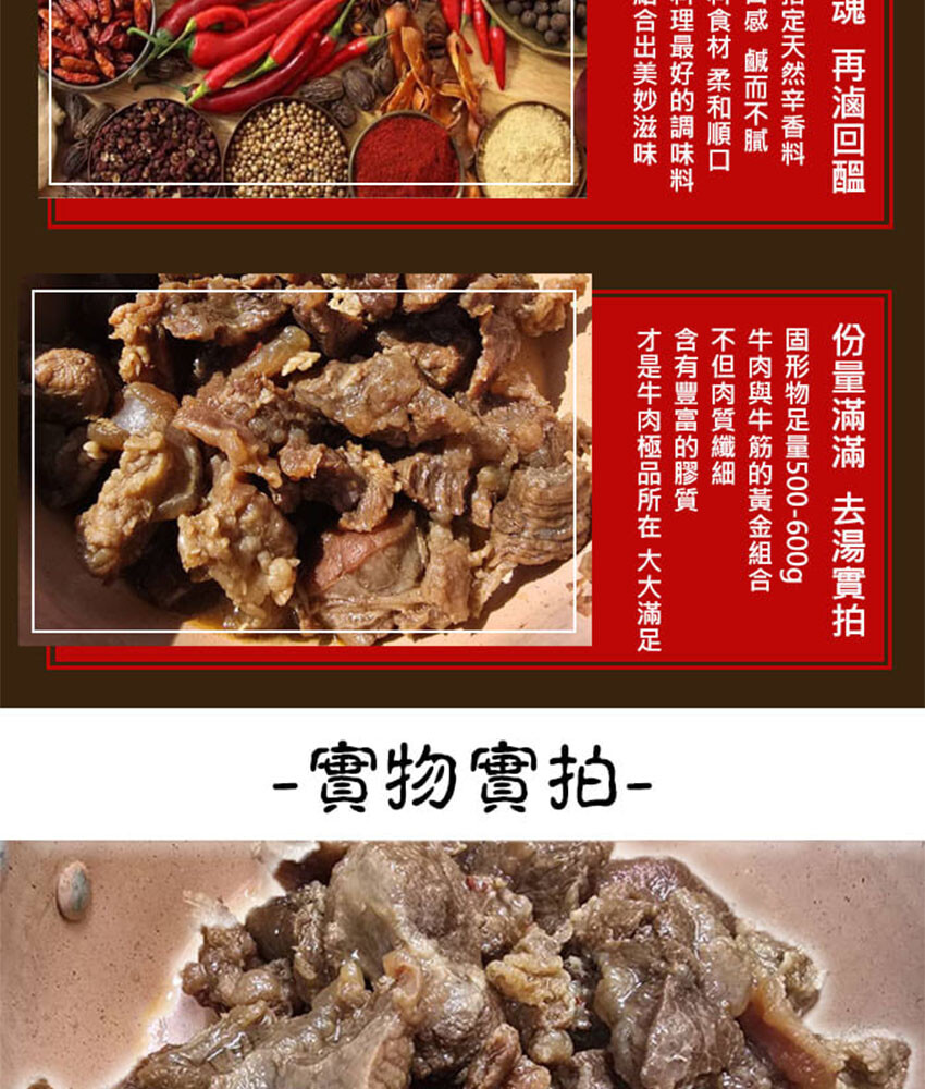 成份:水、牛肉(巴拉圭)、牛筋(巴拉圭)、油膏、轉化糖液(蔗糖、水)、非基因改造脫脂大豆片、小麥、食鹽、乙醯化己二酸二澱粉(增稠劑)、玉米糖漿、苯甲酸鈉(防腐劑)、酵母抽出物、辣豆瓣醬(辣椒、水、非基因改造黃豆、鹽)、麻油、L-麩酸鈉(調味劑)、呈味核苷酸二鈉(調味劑)、糖、乳酸(酸味劑)、大豆油、冰糖、長辣椒、牛肉湯粉A(鹽、麥芽糊精、L-麩酸鈉(調味劑)、糖、香辛料(蔥、薑、桂皮)、胺基乙酸(調味劑)、DL-胺基丙酸(調味劑)、二氧化矽(抗結塊劑)、牛油、檸檬酸(酸味劑)、紅燒牛肉高湯(醬油、水、糖、鹽、牛油、豬肉、焦糖色素(著色劑)、香辛料(蔥、薑、蒜)、D-山梨醇液70%(甜味劑、保濕劑)、樹薯澱粉、琥珀酸二鈉(調味劑)、胺基乙酸(調味劑)、DL-胺基丙酸(調味劑)、油性辣椒萃取物(葵花油、辣椒萃取物)、蔗糖脂肪酸酯(乳化劑)、雞粉(食鹽、L-麩酸鈉(調味劑)、呈味核苷酸二鈉(調味劑)、琥珀酸二鈉(調味劑)、玉米澱粉、麥芽糊精、糖、雞湯、雞肉、雞油、醬油、水解大豆蛋白、香料、酵母抽出物、油菜籽油、白胡椒粉、葵花籽油、糊精)、青花椒末、朝天椒粉、孜然粉(孜然籽)、八角、五香粉(肉桂、八角、小茴香、丁香、花椒)、草果粉、小茴香粉、肉桂粉、百草粉(八角、小茴香、肉桂、丁香、甘草)。