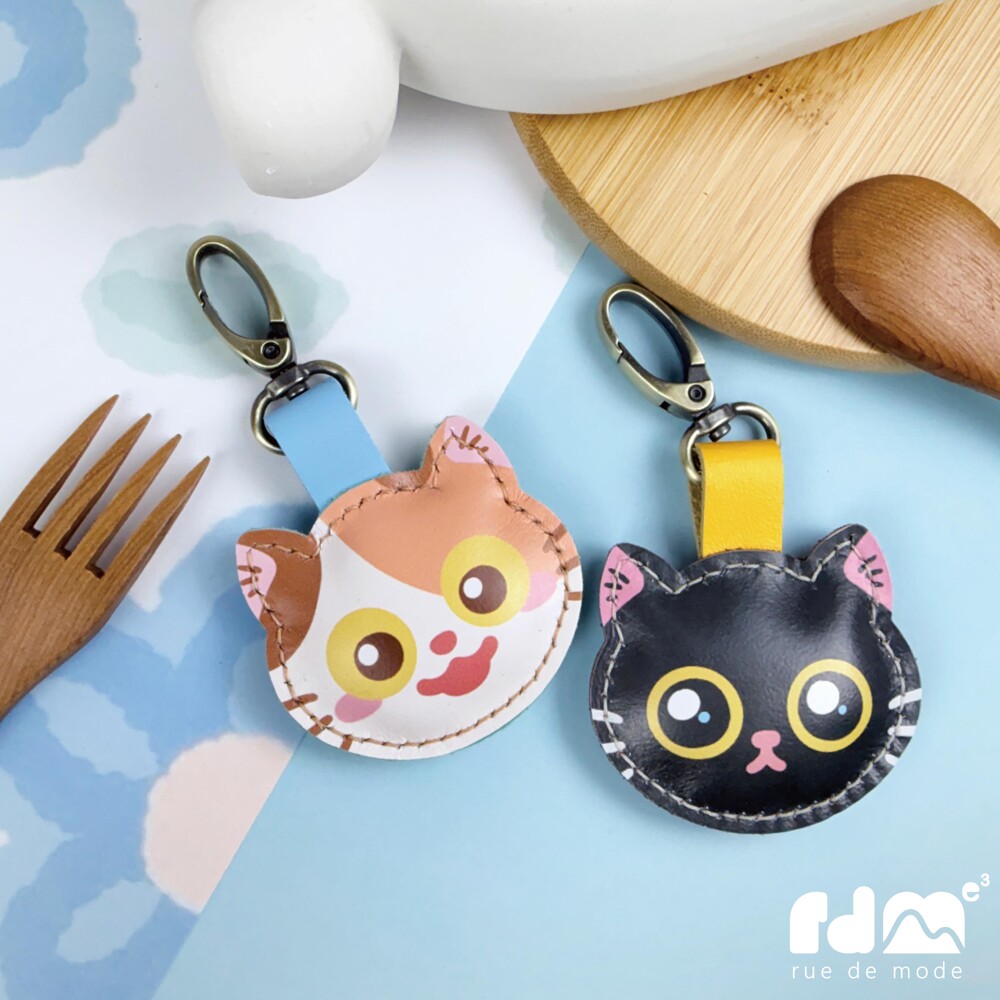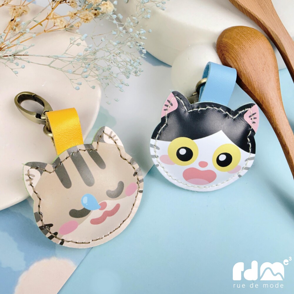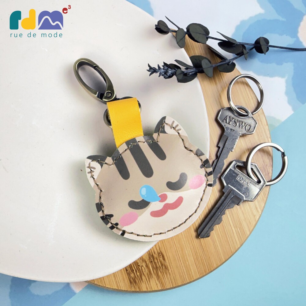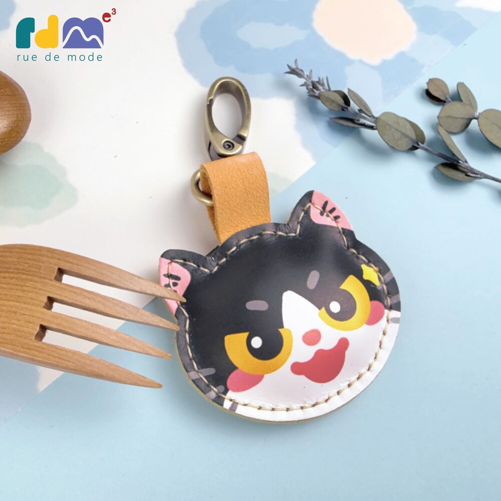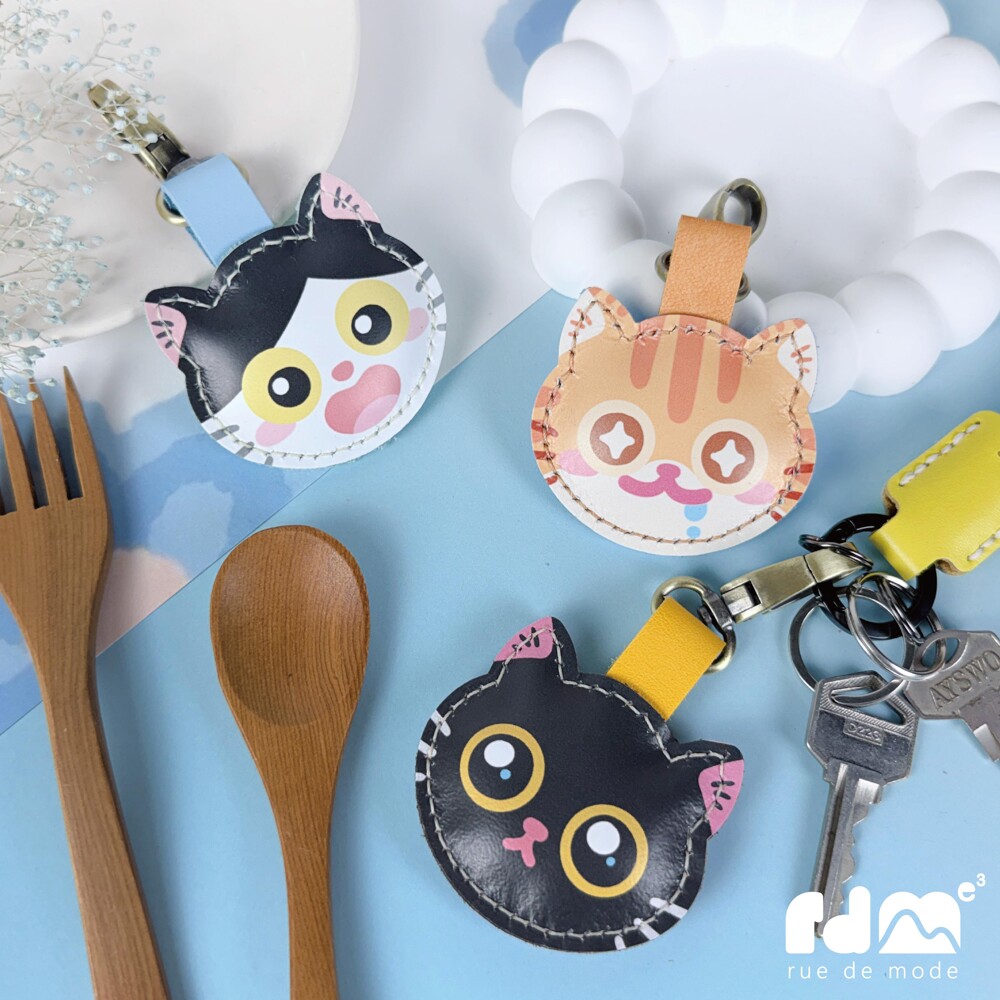 以可愛貓咪為靈感打造的印刷皮革鑰匙圈,由插畫家親自繪製角色造型,再由麥子庇護工場的身心障礙夥伴手工縫製完成。