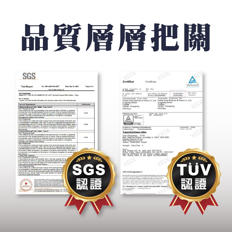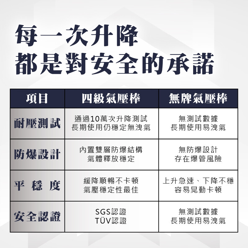 我們的四級氣壓棒,採用 SGS+TÜV 雙國際安全認證,並通過高壓、耐爆、平穩度等多項檢測,只為給你:
