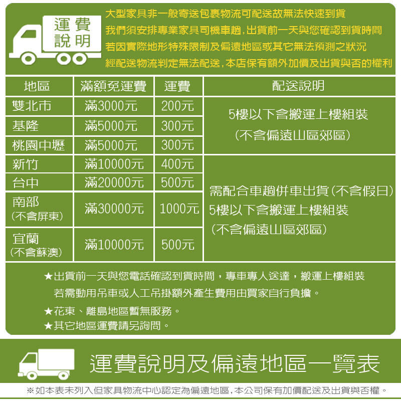 3. 商品配送日期時間若無法配合您希望到貨時段,需以本店安排車趟為主,如造成您的不便,敬請見諒。