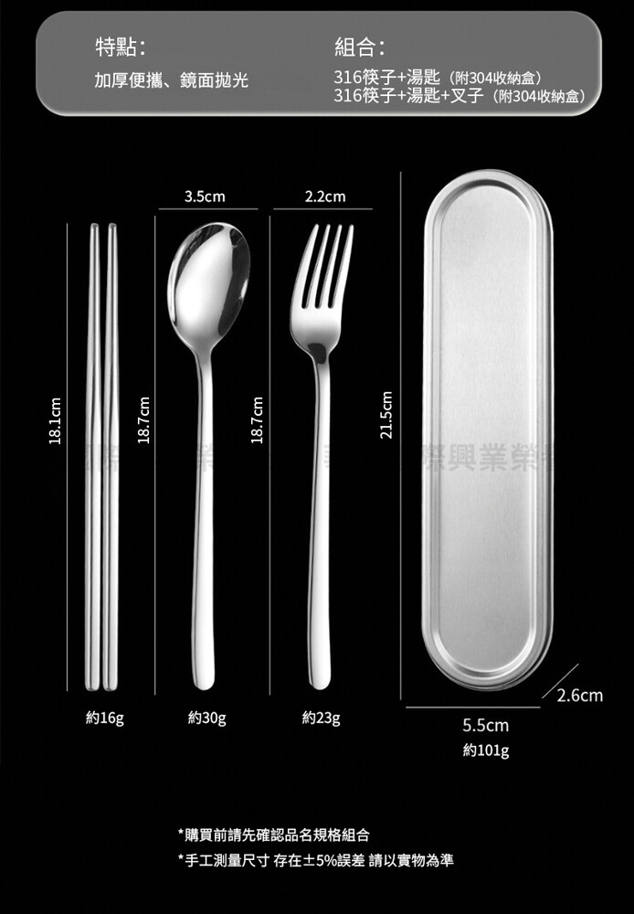 組合:316筷子+湯匙(附304收納盒)、316筷子+湯匙+叉子(附304收納盒) 依選購品名規格出貨