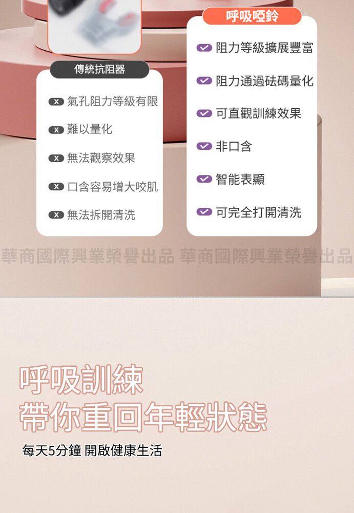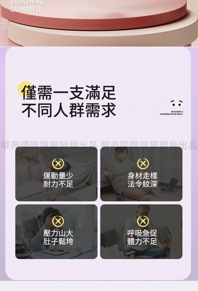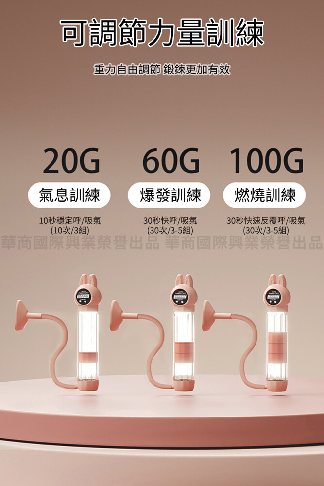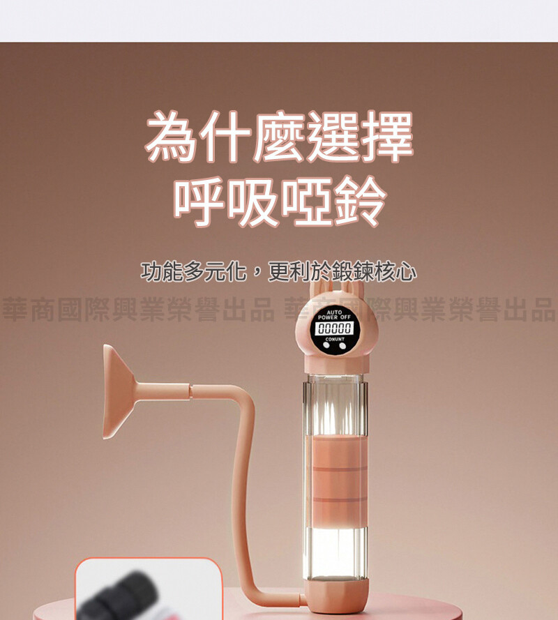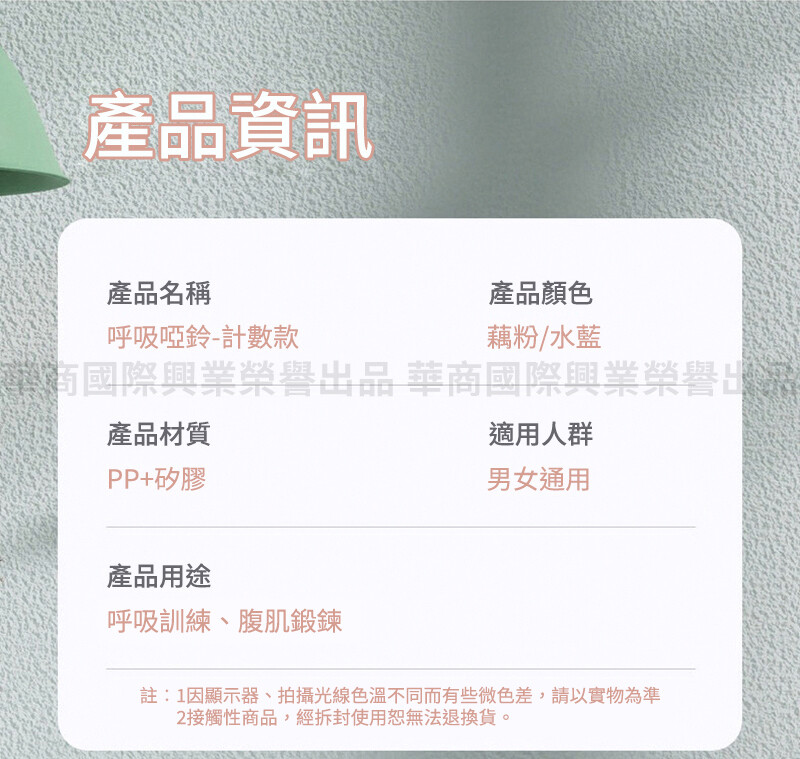產品名稱:呼吸啞鈴-計數款 產品顏色:藕粉/水藍 產品材質:PP+矽膠 適用人群:男女通用 產品用途:呼吸訓練、腹肌鍛鍊 溫馨提示: 1因顯示器、拍攝光線色溫不同而有些微色差,請以實物為準 2接觸性商品,經拆封使用恕無法退換貨。