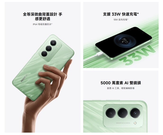 Redmi 15 5G 採用全等深微曲背蓋設計,透過使用相同弧度的四曲面背蓋,讓機身更加貼合手掌,握持手感更加舒適;而鋁合金相機裝飾與雕刻感細節,則可營造精緻、現代且魅力無邊的高質感外觀,台灣上市版本提供「午夜黑」、「漣漪綠」、「鈦灰色」等款式。防護部分,支援 IP64 防潑水與防塵等級。