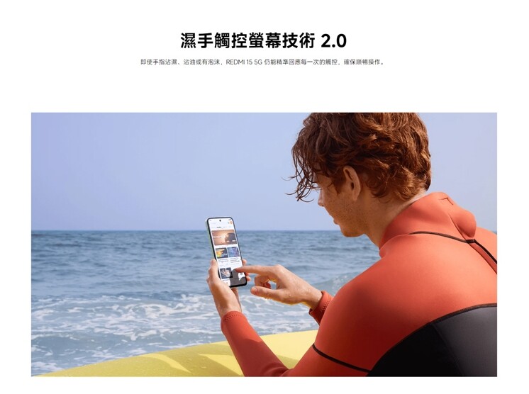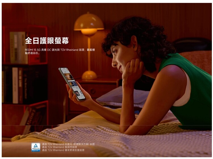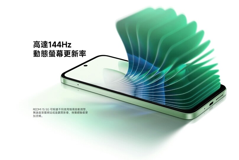 Redmi 15 5G 搭載 6.9 吋 FHD+ 沉浸式螢幕,除了支援最高 144Hz 螢幕更新率外,同時具備 DC 調光與 TÜV Rheinland 認證(低藍光、無頻閃、晝夜節律友善),有效降低螢幕藍光對肉眼的傷害。搭配濕手觸控螢幕技術 2.0,即便手指沾濕、沾油或是有泡沫殘留,螢幕依舊可以精準回應每一次的觸控。