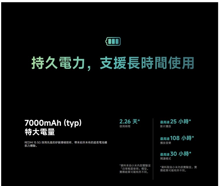 Redmi 15 5G 運行 Xiaomi HyperOS 2 操作介面,搭載高通 Snapdragon 6s Gen 3 八核心處理器,提供 4GB + 128GB、8GB + 256GB 規格版本,搭配 microSD 記憶卡最高可擴充 2TB 儲存容量。續航部分,配備 7,000mAh 大電量, 結合先進的矽碳陽極技術,進一步提升手機續航能力;支援 33W 快速充電、18W 反向充電。