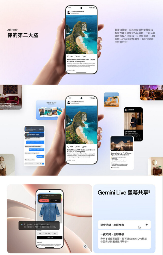 OPPO Find X9 搭載全新 ColorOS 16,導入多項強大的 OPPO AI 功能,不僅在影像優化上支援 AI 消除反光、AI 消除拖影等進階處理,還具備多元的生成式 AI 應用,全新的一鍵閃記與 AI 記憶倉功能,只需按下快捷鍵即可讓 AI 即時識別螢幕內容,並智慧歸納至記憶倉中;搭配與 Gemini 的深度整合,用戶能透過對話快速檢索所需資訊。另外還有 AI 相簿、AI 人像補光、圈定即搜、AI 筆記助理、AI 文件助理與 AI 聊天建議等實用工具。