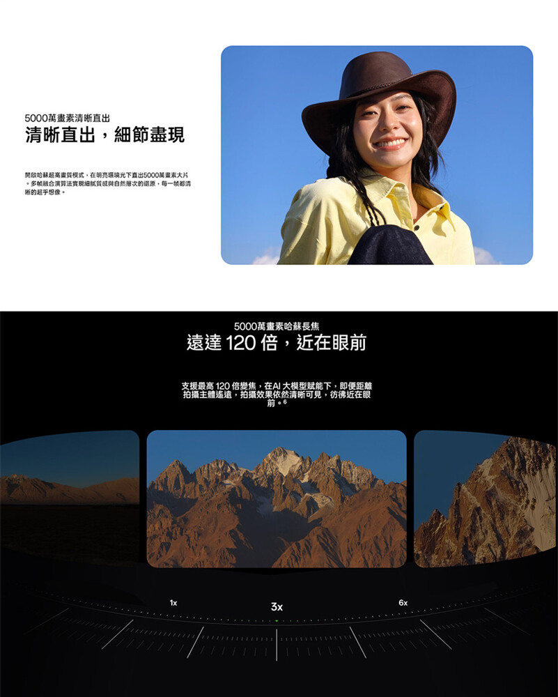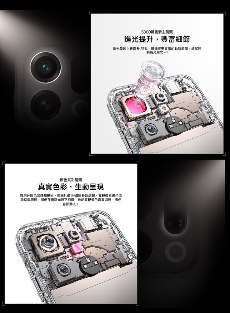 ◎ 後置 5,000 萬畫素主鏡頭 + 5,000 萬畫素超廣角鏡頭 + 5,000 萬畫素潛望式長焦鏡頭 + 200 萬畫素原色真彩鏡頭