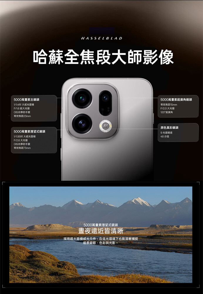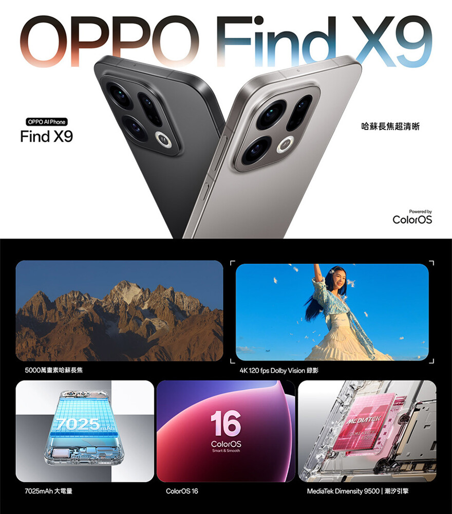 OPPO Find X9 後置 5,000 萬畫素主鏡頭 + 5,000 萬畫素超廣角鏡頭 + 5,000 萬畫素潛望式長焦鏡頭 + 200 萬畫素原色真彩鏡頭,同時皆為與哈蘇共同開發的影像系統,其中主鏡頭擁有 Sony LYT-808 感光元件、1/1.4 吋感光面積;潛望式長焦鏡頭最高可支援最高 120 倍變焦;原色真彩鏡頭則使用 9 光譜通道,透過 48 分區精準調節色溫,畫面色彩更精準、主體顏色經校正更自然,顏色更接近肉眼所見,結合 3X 人像閃光燈,夜晚下拍人像更美麗。