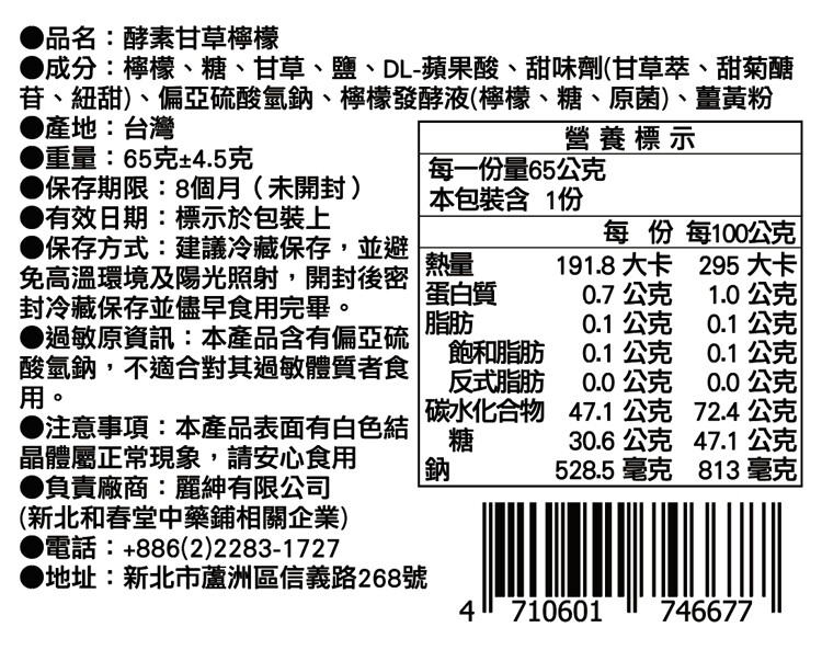 ※過敏原訊息:本產品含有偏亞硫酸氫鈉,不適合對其過敏體質者食用