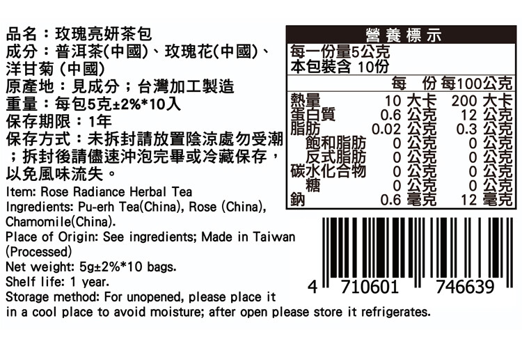 成份 : 普洱茶(中國)、玫瑰花(中國)、洋甘菊 (中國)