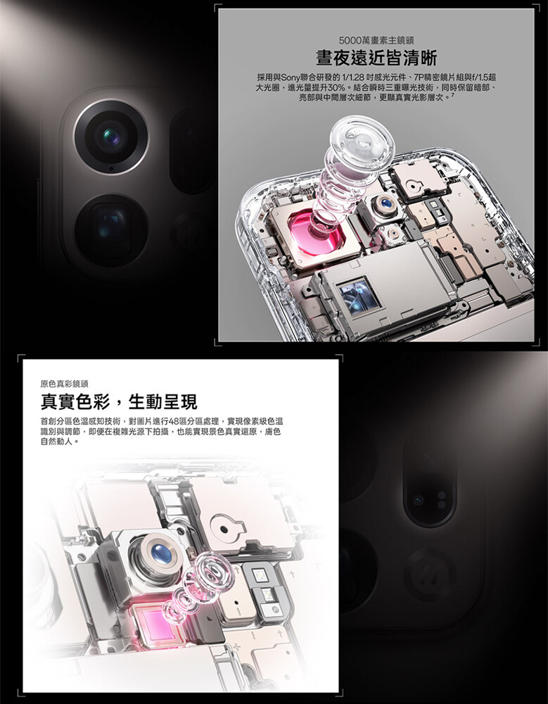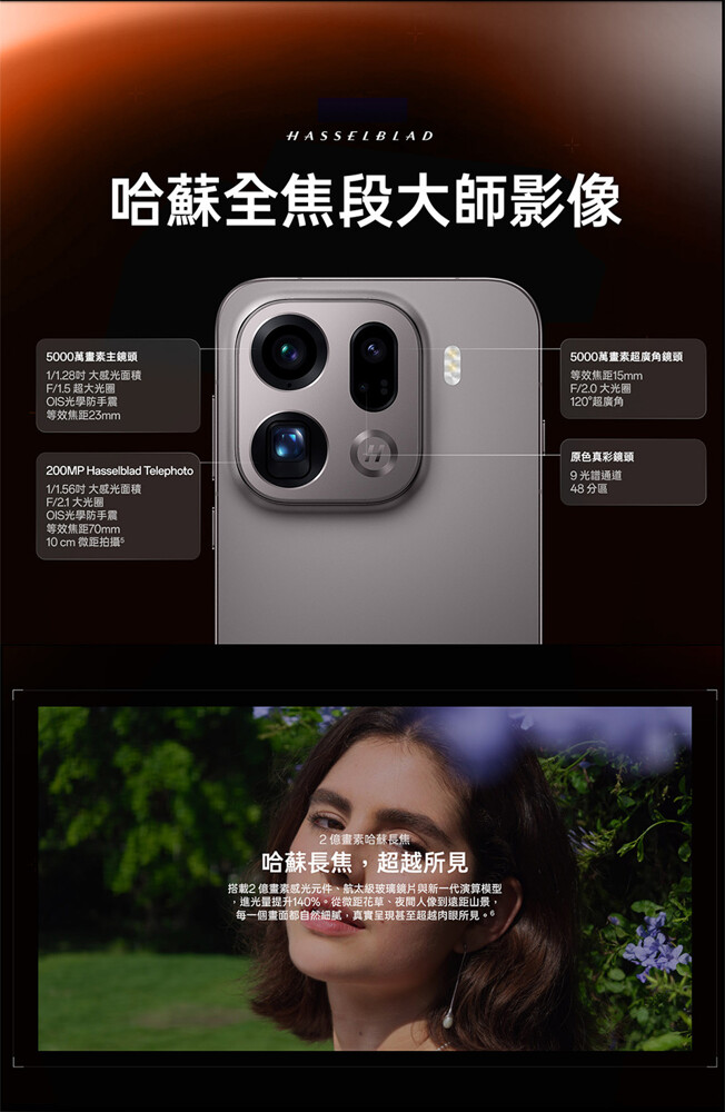 OPPO Find X9 Pro 後置 5,000 萬畫素主鏡頭 + 5,000 萬畫素超廣角鏡頭 + 2 億畫素長焦鏡頭 + 200 萬畫素原色真彩鏡頭,同時皆為與哈蘇共同開發的影像系統,其中主鏡頭擁有 Sony LYT-828 感光元件、1/2.28 吋感光面積;長焦鏡頭支援最高 120 倍變焦;原色真彩鏡頭則使用 9 光譜通道,透過 48 分區精準調節色溫,畫面色彩更精準、主體顏色經校正更自然,顏色更接近肉眼所見,結合 3X 人像閃光燈,夜晚下拍人像更美麗。