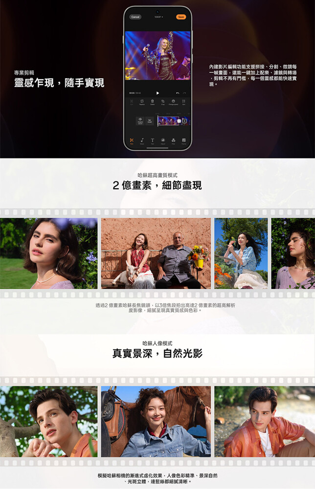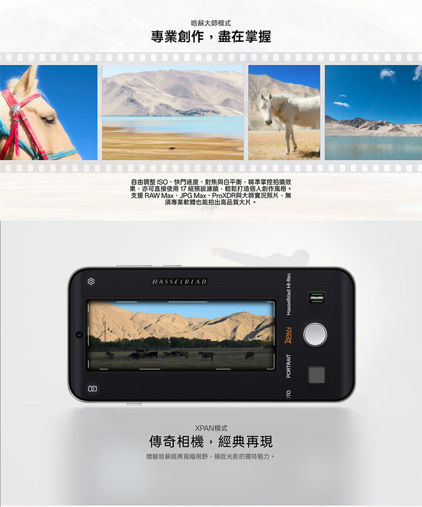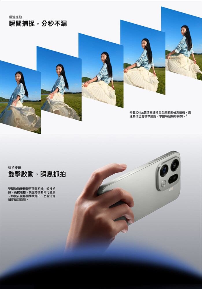 OPPO Find X9 Pro 在錄影能力上全面升級,主鏡頭與長焦鏡頭支援 4K 120fps Dolby Vision 拍攝,全焦段皆可錄製 4K 60fps 影片,並具備寬廣的 BT.2020 色域、最高 10-bit 色深與 14 段動態範圍,輕鬆對應專業級調色與後製流程。機身通過 ACES 與 Dolby Vision 認證,內建 LUT 調色檔與影片編輯工具,電影級創作一機完成。另支援哈蘇經典寬幅 XPAN 模式、哈蘇人像模式與 Live Photo 實況照片等功能,捕捉每一刻都更具故事感。
