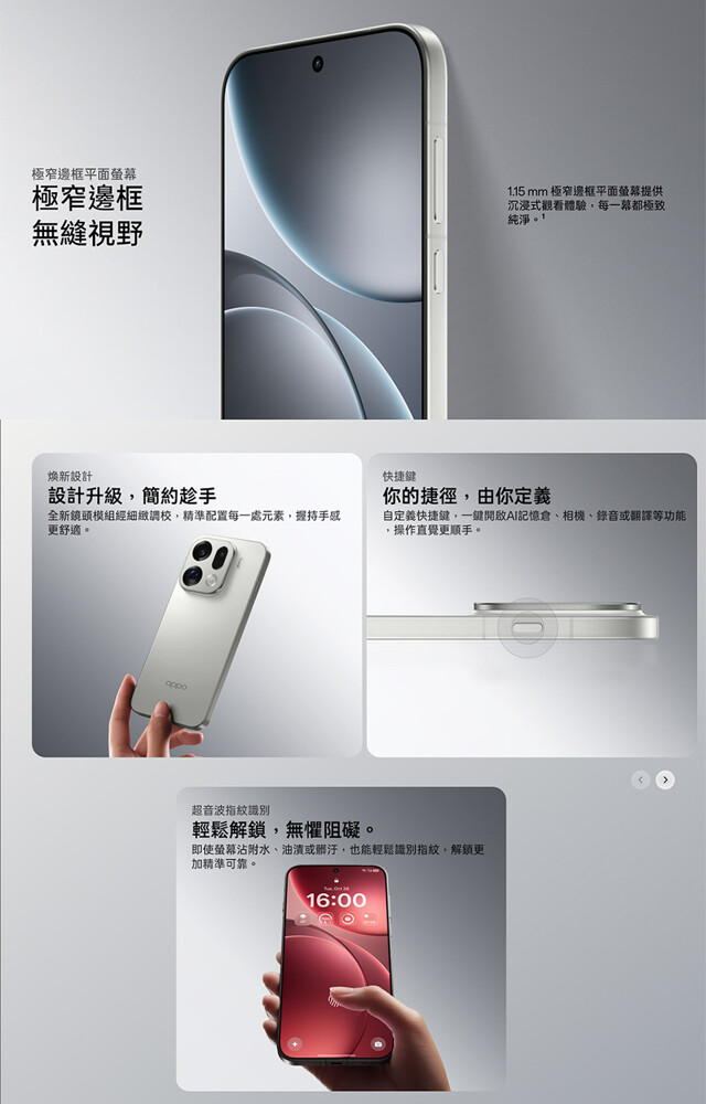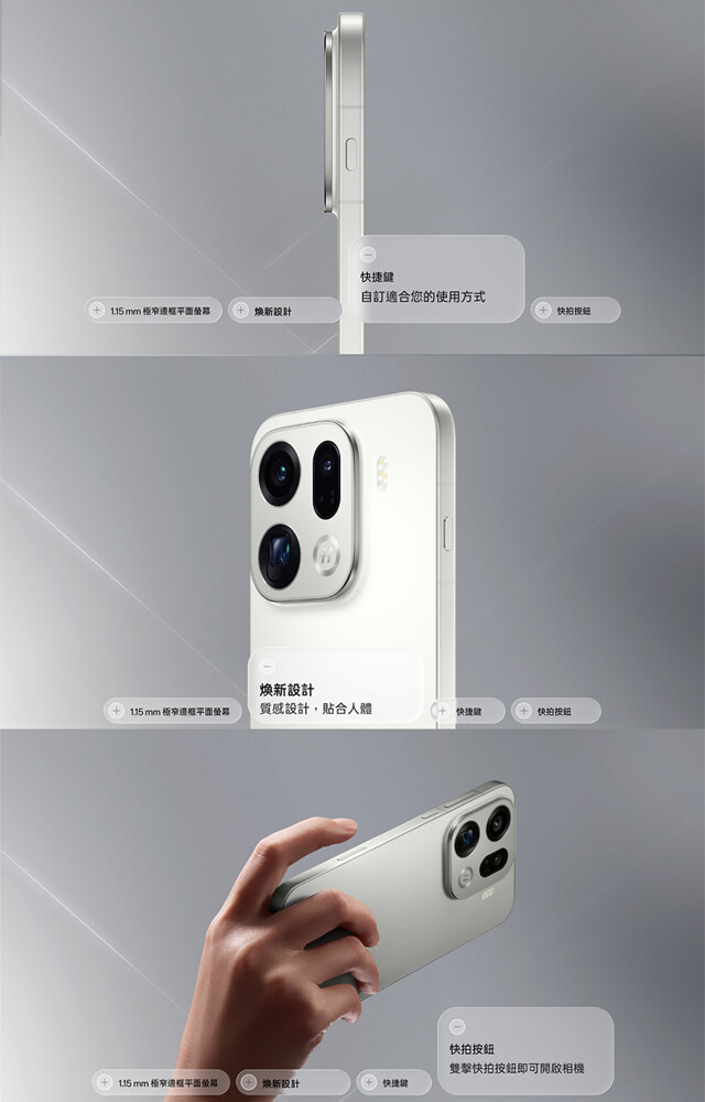OPPO Find X9 Pro 以輕薄流暢的機身設計為核心,採用平面螢幕並大幅降低鏡頭模組的凸起,帶來更舒適、貼手的握持手感。機身具備 IP66 / IP68 / IP69 防塵防水等級,並支援濕手觸控。外觀採用一體成型冷雕玻璃工藝,細緻的磨砂質感兼具高級手感與耐磨耐刮特性。機身左側配備快捷鍵,可一鍵開啟自訂的小工具,以及快拍按鈕只要雙擊就能開啟相機。