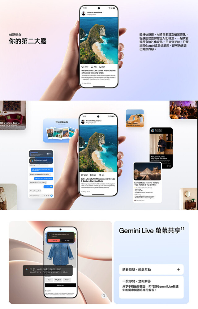 OPPO Find X9 Pro 搭載全新 ColorOS 16,導入多項強大的 OPPO AI 功能,不僅在影像優化上支援 AI 消除反光、AI 消除拖影等進階處理,還具備多元的生成式 AI 應用,全新的一鍵閃記與 AI 記憶倉功能,只需按下快捷鍵即可讓 AI 即時識別螢幕內容,並智慧歸納至記憶倉中;搭配與 Gemini 的深度整合,用戶能透過對話快速檢索所需資訊。另外還有 AI 相簿、AI 人像補光、圈定即搜、AI 筆記助理、AI 文件助理與 AI 聊天建議等實用工具。