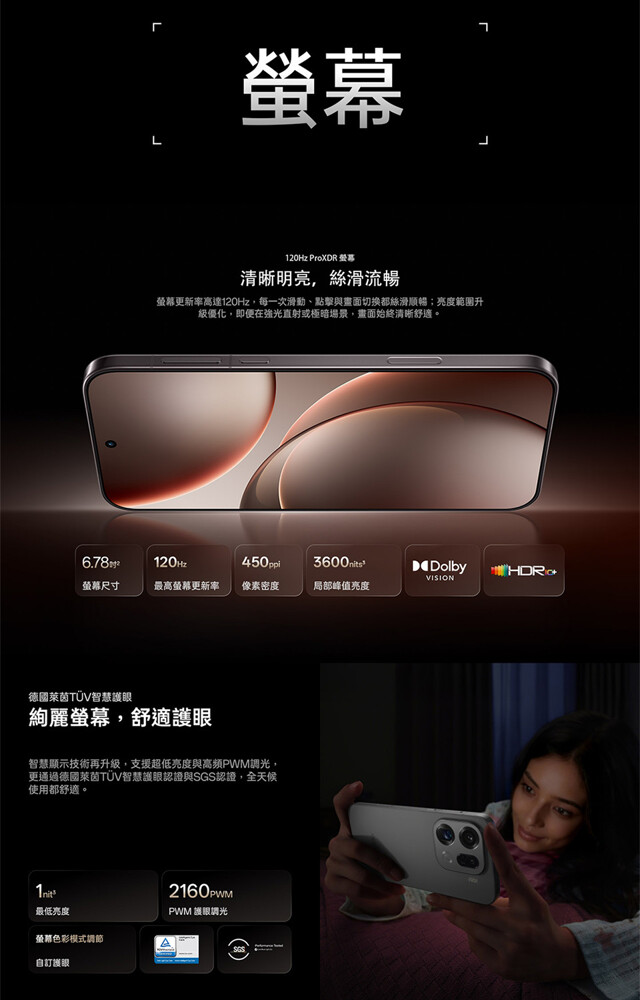 OPPO Find X9 Pro 採用極窄四等邊框懸浮微曲螢幕設計,邊框僅 1.18mm,螢幕占比高達 95.5%,視覺上更顯沉浸。配備 6.78 吋 2,772 x 1,272pixels 解析度 ProHDR 螢幕,支援 120Hz 更新率,局部峰值亮度最高可達 3,600nits,全局峰值亮度則為 1,800nits。通過德國萊茵 TÜV 護眼認證與 SGS 認證,並支援最低 1nit 亮度、2160Hz 高頻 PWM 調光,在各種環境下都能維持明亮、自然且舒適的觀看體驗。