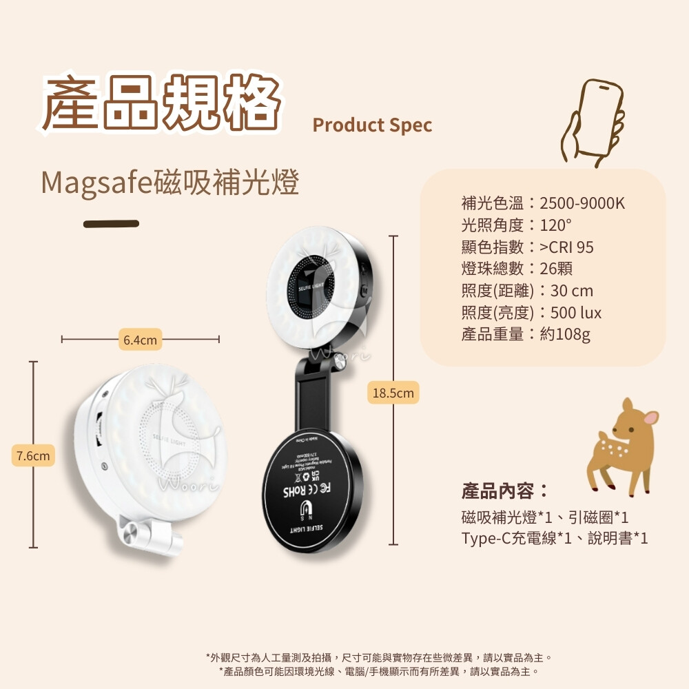 產品內容:磁吸補光燈*1、引磁圈*1、Type-C充電線*1、說明書*1
