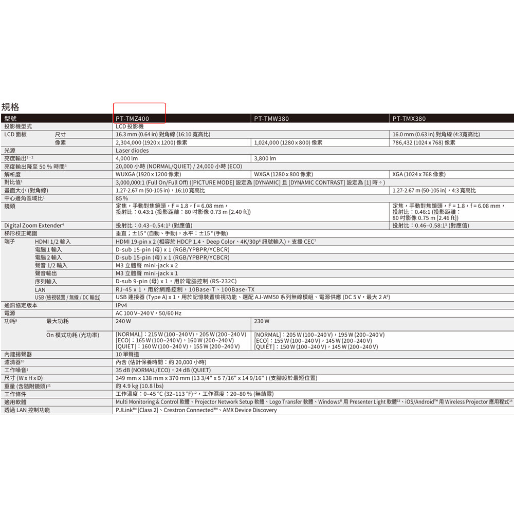 雷射光源以及可重複使用的ECO濾清器可使用長達20,000小時 無須更換,並減少能耗達20%,減少浪費、麻煩並節省成本。 TMZ400系列具備自動垂直梯形校正、4角及水平 / 垂直梯形校 正、6點校正功能,方便設定。而 Digital Zoom Extender 和 Image Shift功能更能增加選擇裝設位置的靈活彈性。