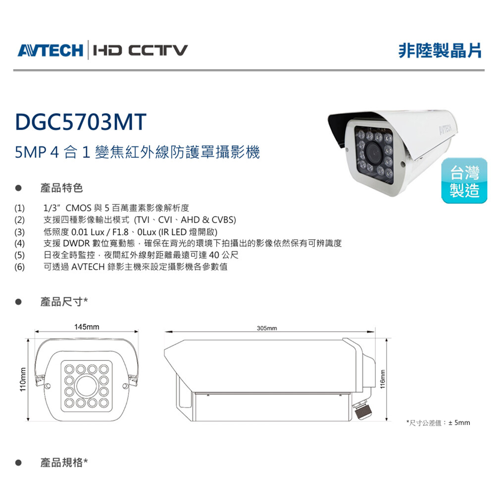 -1/3”CMOS與5百萬畫素影像解析度。