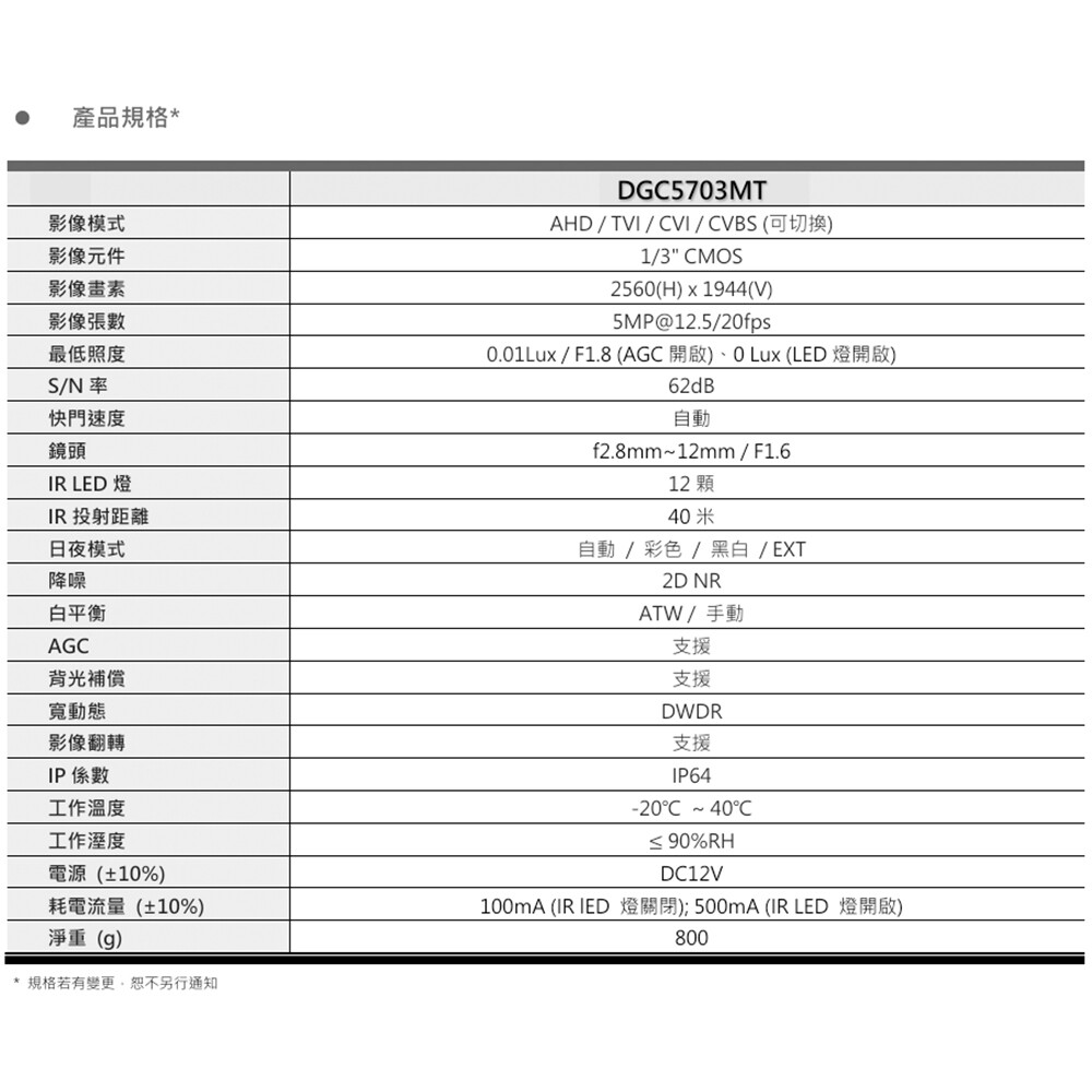 -低照度0.01 Lux / F1.8、0Lux (IR LED 燈開啟)。