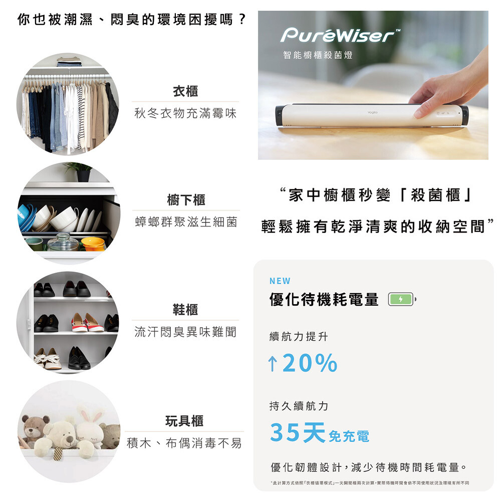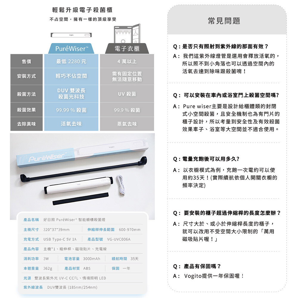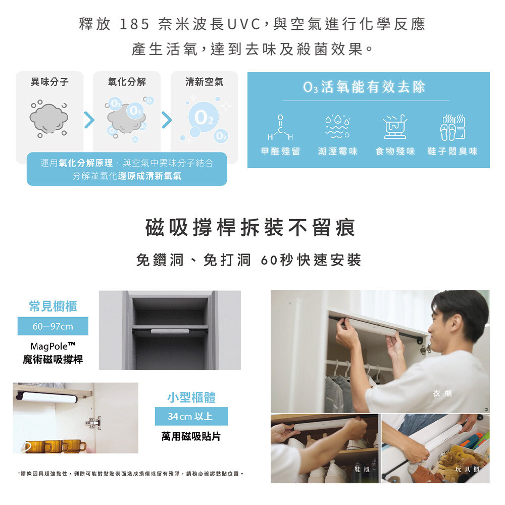 內容物:PuréWiser⁺™智能櫥櫃殺菌燈、Type-C充電線、魔術撐桿x1、磁吸貼片x1、UVC燈管、原廠變壓器
